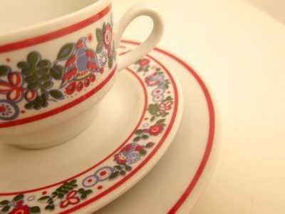 カップとソーサーには、チロリアンテープのように可愛らしい小さな鳥やお花などのモチーフが描かれており、ケーキ皿には大きめのお揃いのイラストが入っています。