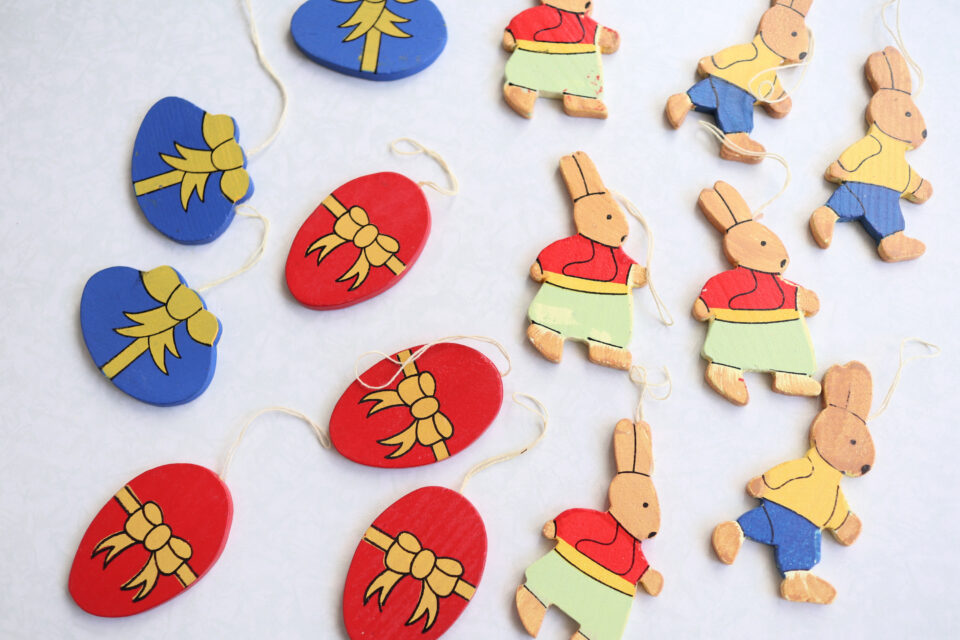 赤と青を基調にしたヴィンテージインテリア飾り14個セット。 春の訪れを祝う復活祭のデコレーション用で、型抜きクッキーのようなイースターバニーがとってもキュート。 窓辺や壁などに気軽に飾れるよう、ぶらさげ用の紐がついています。