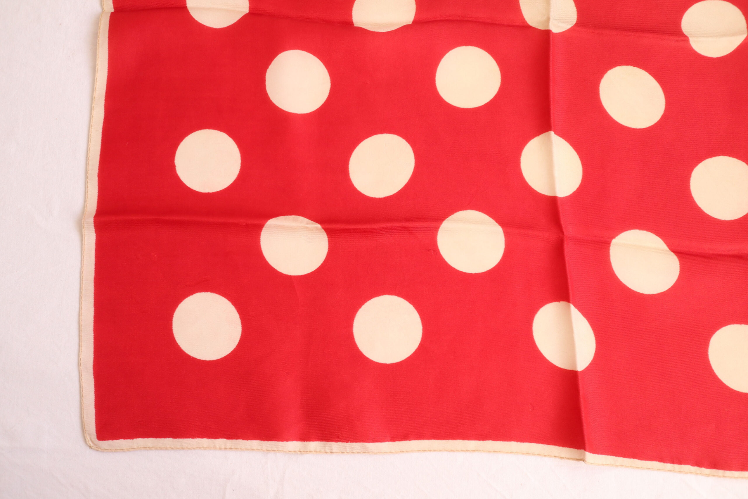 レトロポップな水玉柄ヴィンテージスカーフを蚤の市で見つけました。 60年代の雰囲気ムンムンなドット模様で首回りのオシャレを小粋に演出してくれます。 ビンテージ品につき多少のヨレ等が見られますがくしゅっと巻いて使用する分にはさほど気にならないかと思われます。