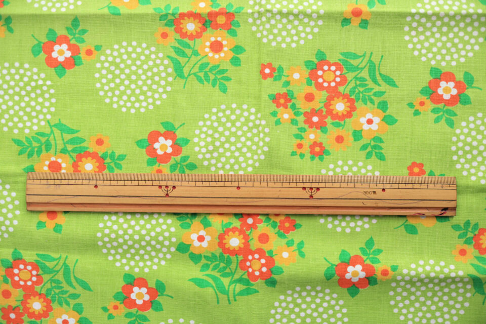 野原に咲く花たちをイメージしたレトロフローラル柄ビンテージ生地。 宝石のように散りばめられた花モチーフが印象的なライムグリーンのファブリックです。 ポーチや小物入れなどバッグの中が明るくなるアイテム作りにいかが?