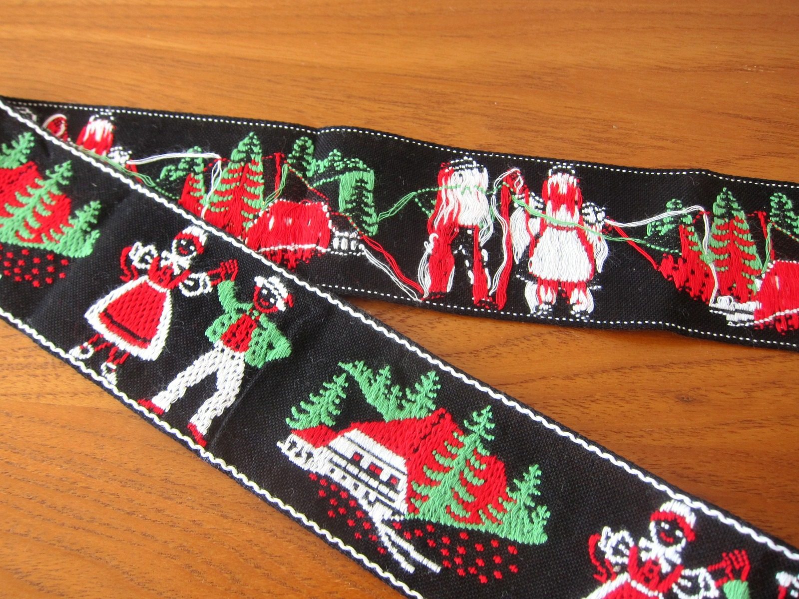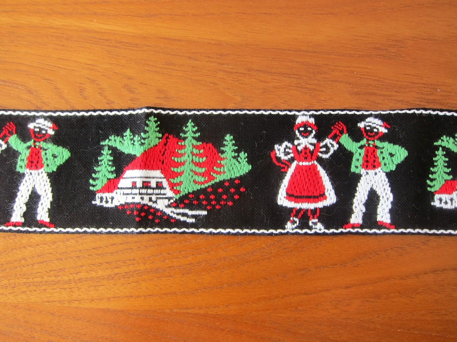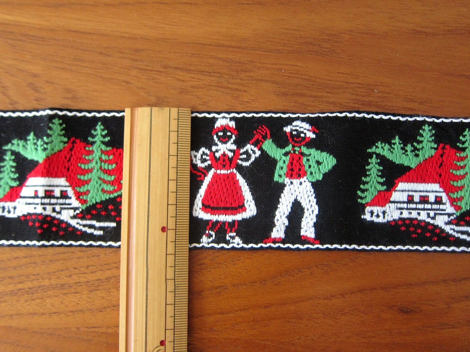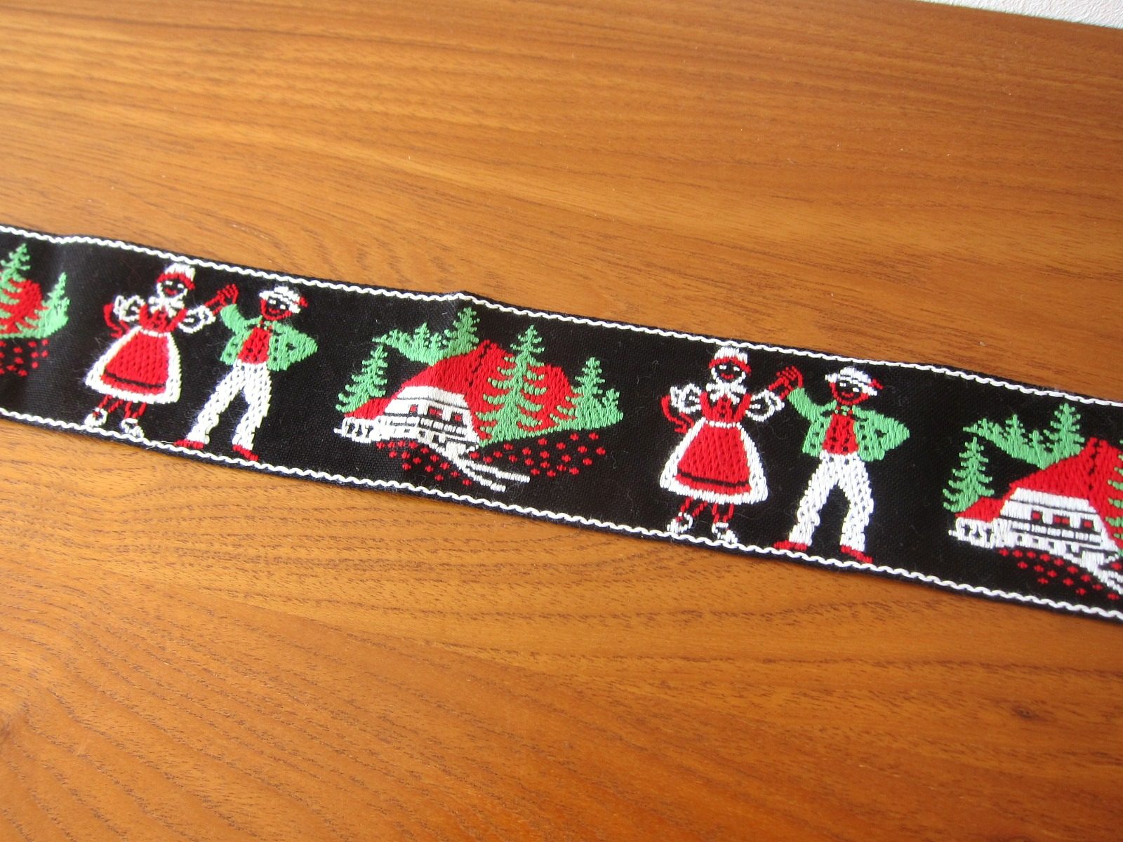 黒地に白いトリミングが施されたチロルテープ。 森に佇むコテージ小屋と民族衣装をまとった男女が楽しげにダンスをしている様子が刺繍された、東欧の雰囲気たっぷりのデザインです。 これ一つで一気にフォークロアな印象に。 手芸材料にどうぞ。