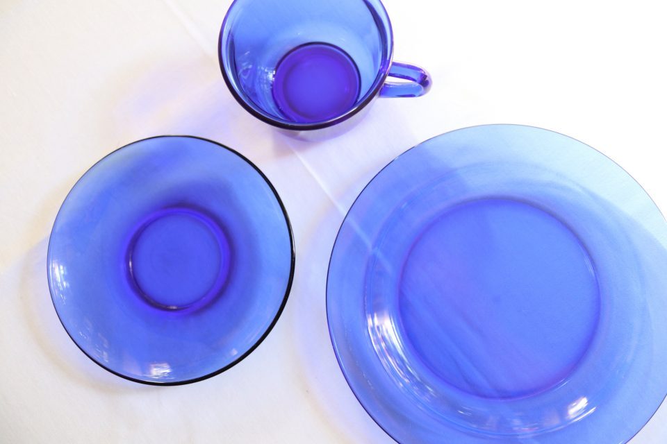 ヴィンテージショップで見つけたフランスArcorocのレトロなカップ&ソーサー。 Arcorocとは乳白色の耐久ガラスで知られるArcopalを抱える仏ARC社の業務食器部門で1963年に登場したブランドです。 透明感のある涼しげな青色カラーでケーキ皿がついた3点セット。