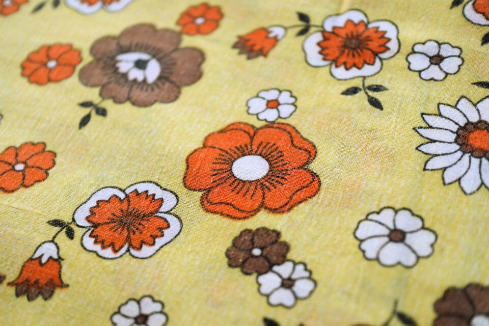 オレンジを主としたさまざまなお花を散りばめたノスタルジックな黄色の花柄ヴィンテージファブリック。