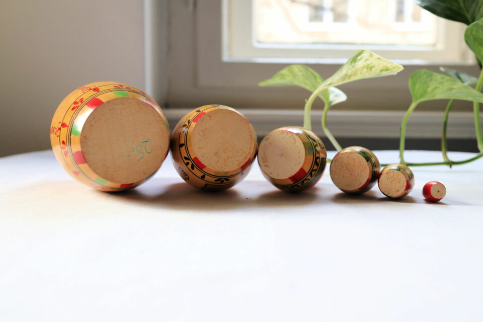 横縞模様のエプロンと赤いショールのロシアの伝統雑貨マトリョーシカ。 同じ衣裳に身を包んだ6人娘です。 入れ子人形として楽しむほか、写真のように並べて飾ってもグッドですよ。
