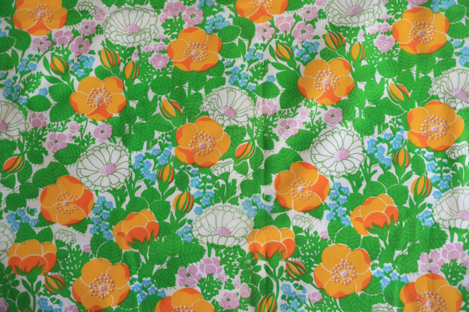 スウェーデンで買い付けた、ほとんど使用感のない良好コンディションのビンテージファブリック。 グリーンとオレンジがふんだんに使われた、初夏の北欧を感じさせる明るい色合いの花模様です。