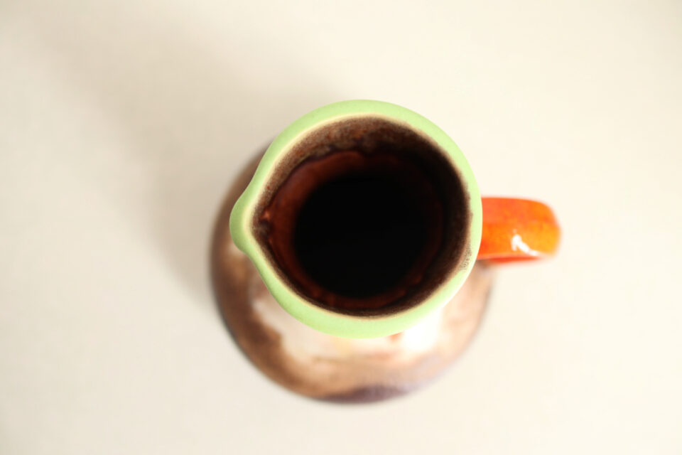 独特な釉薬の重ね方や発色で存在感を放つ、Fat Lava技法で製造された陶器製の花瓶。 旧西ドイツ・Übelacker Keramik 社によるもので、光沢のあるツヤ部分とざらざらとしたマット部分、異なる質感が奇妙にブレンドされたミッドセンチュリーオリジナルのアイテムです。 一部ステッカーの貼ってあったと思われる箇所に多少の跡が残っています。(ほとんど目立たない程度です。)