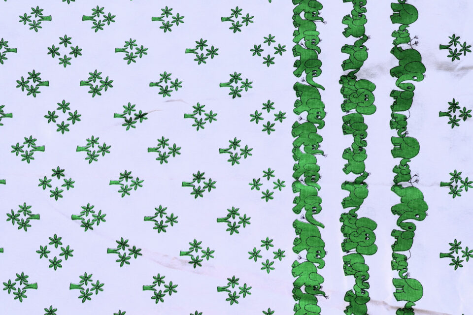 生地の両サイドには愛らしい象たちの群れ、そして真ん中部分には竹林が描かれたグリーンカラーのコットン布はDDRオリジナル生地の中でも特に人気のデザイン。