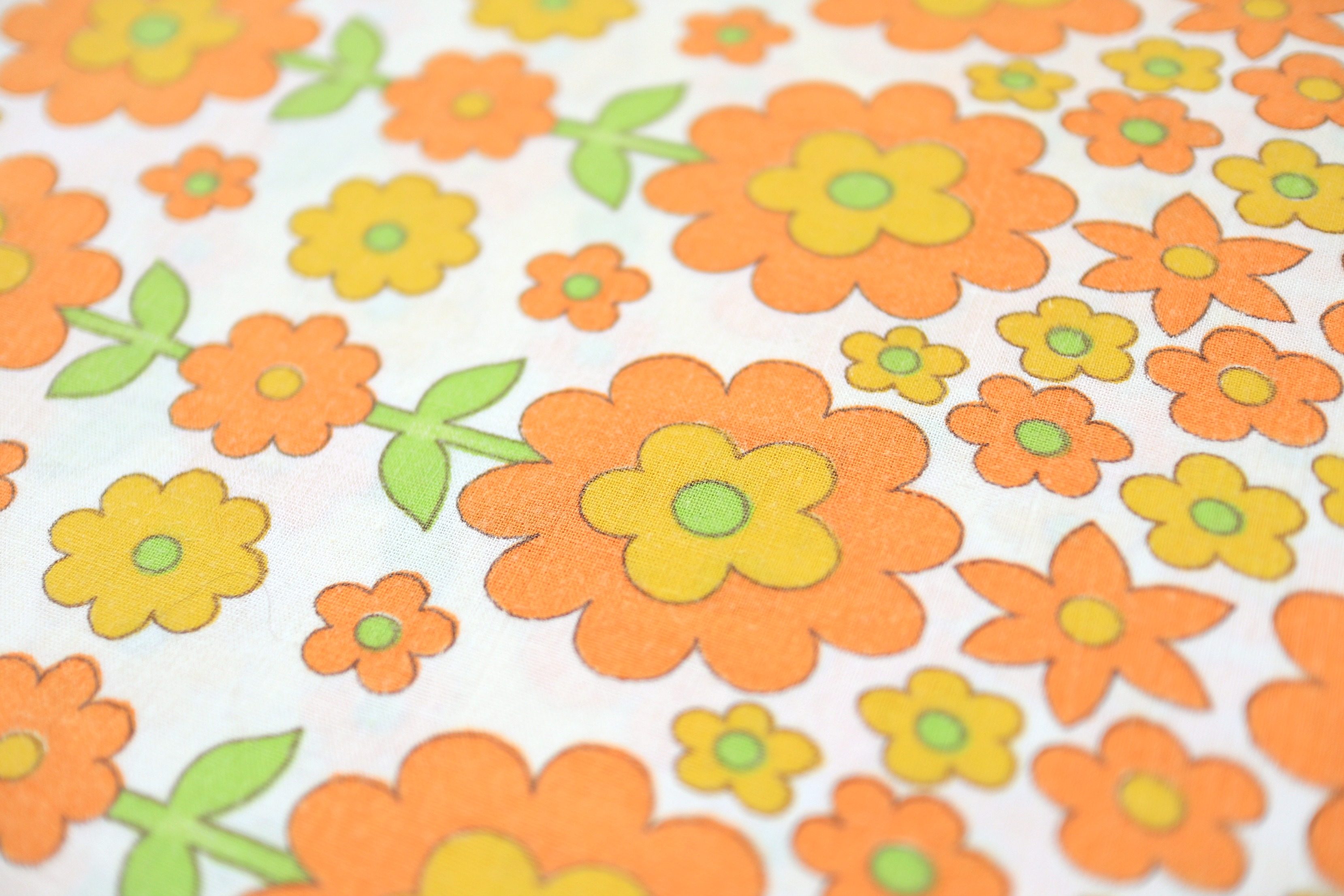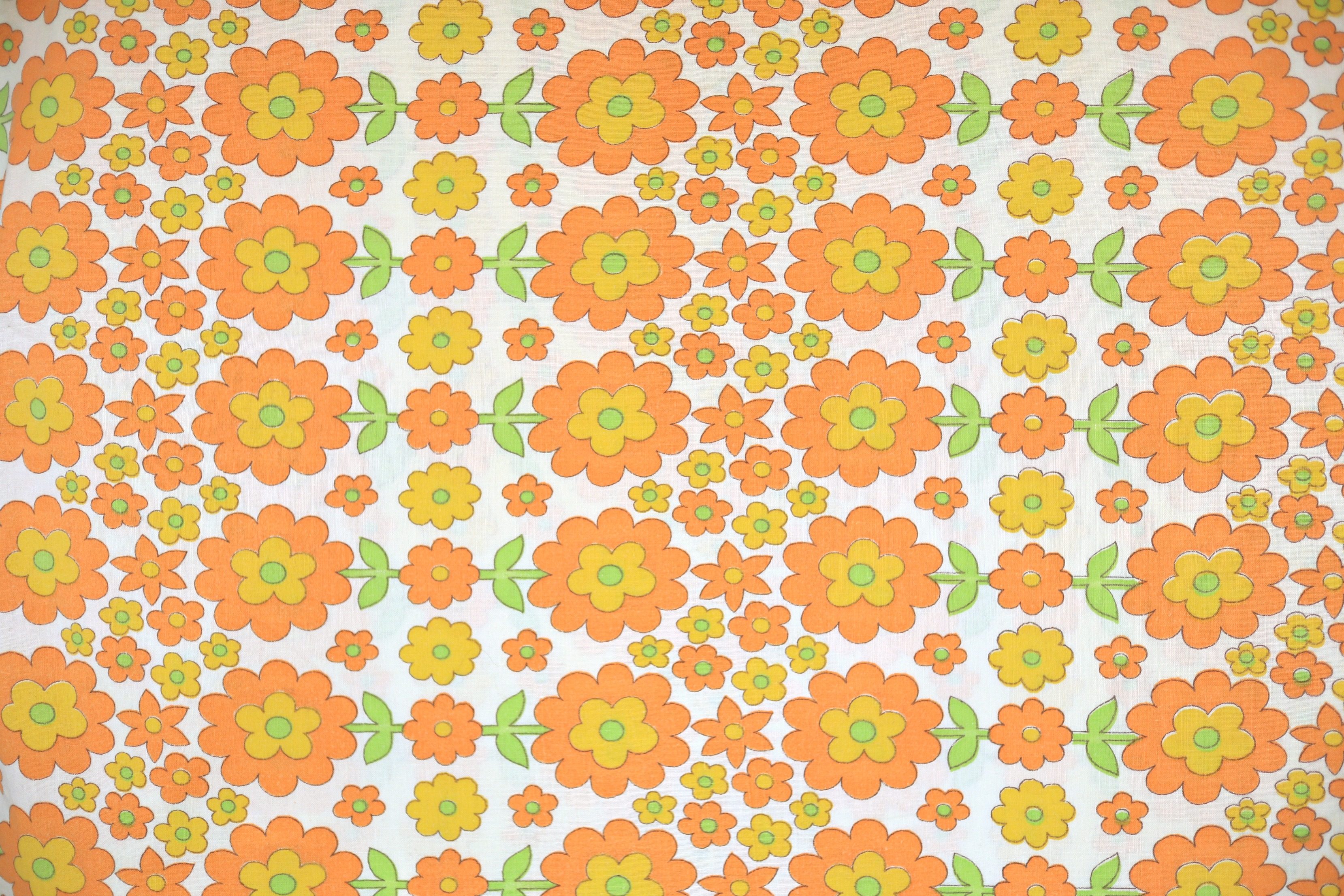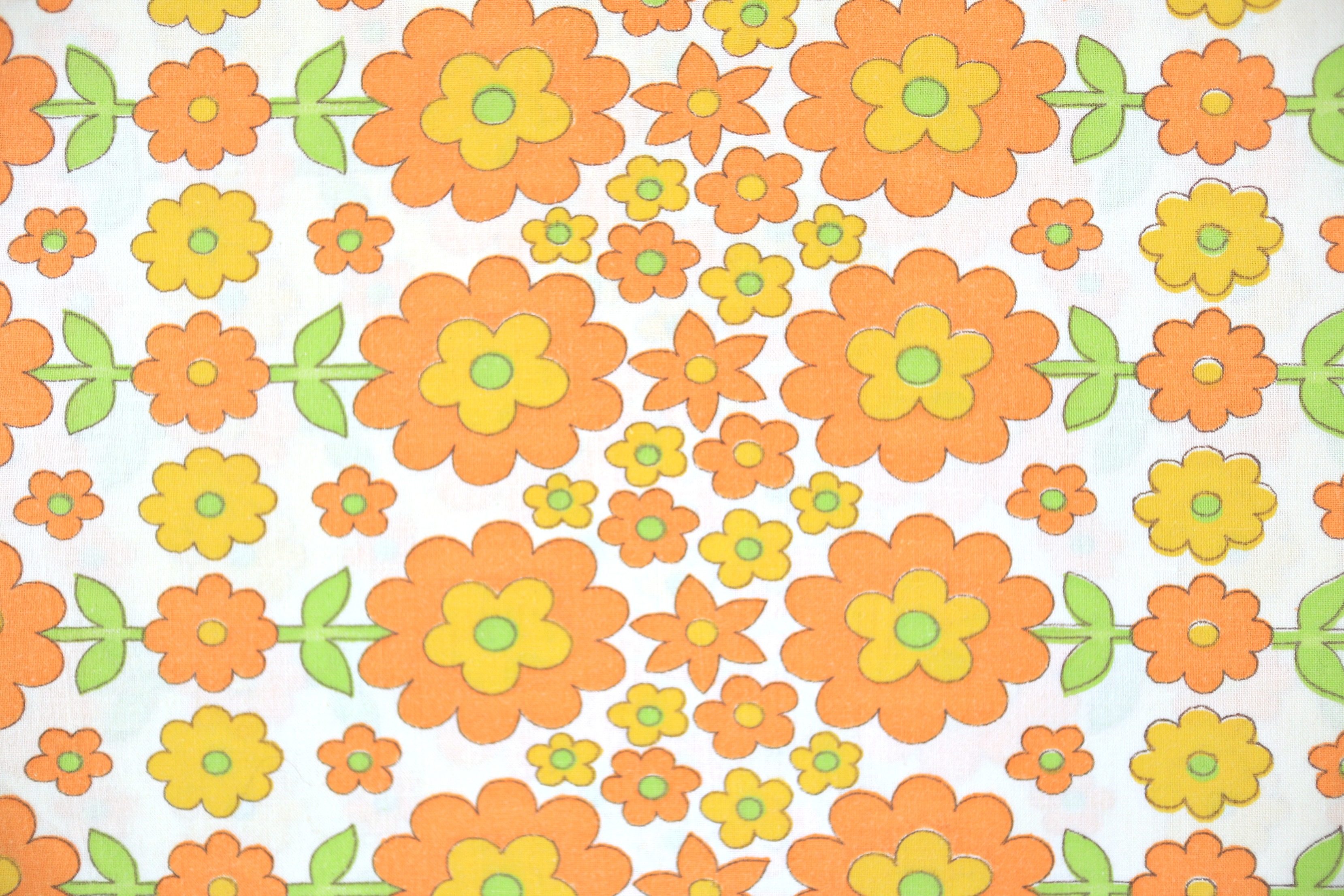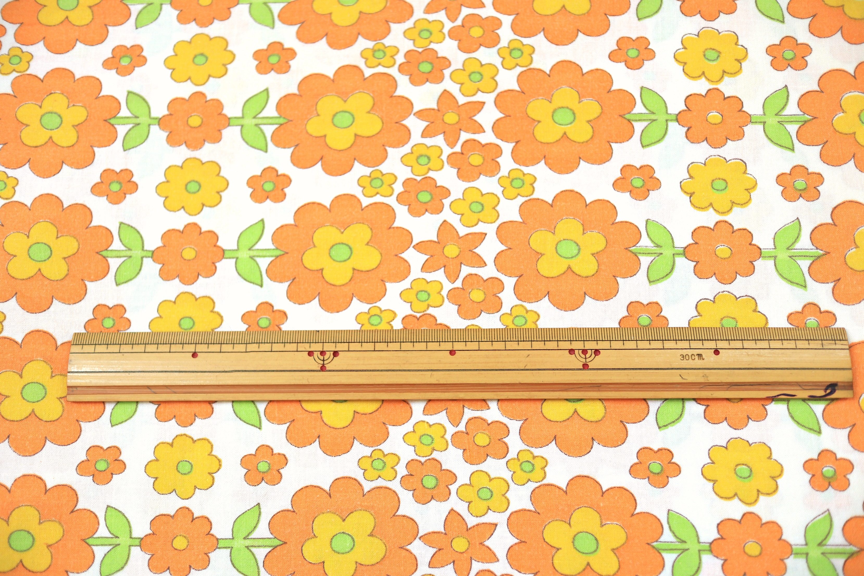 コンテンツにスキップポップでキュートな花モチーフが並んだ、賑やかオレンジ色レトロファブリック。