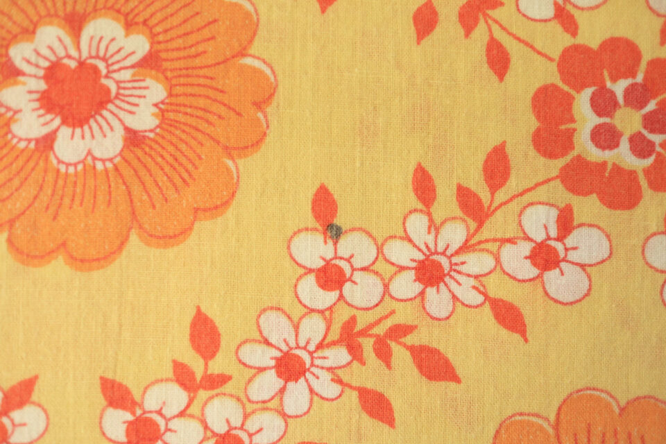 黄色と白の花模様、レトロ感満載の70年代オリジナルヴィンテージファブリック。 ピローケースやトートバッグなどのリメイク材料としておすすめです。