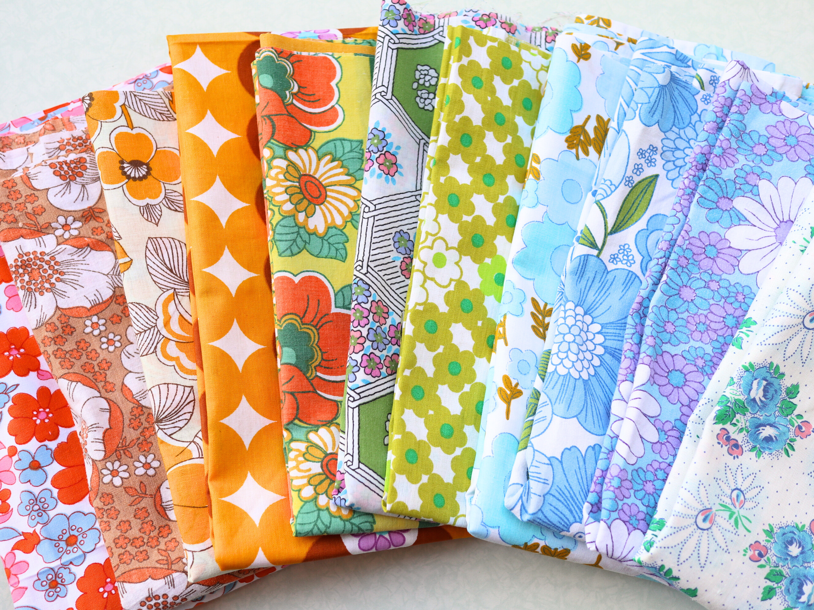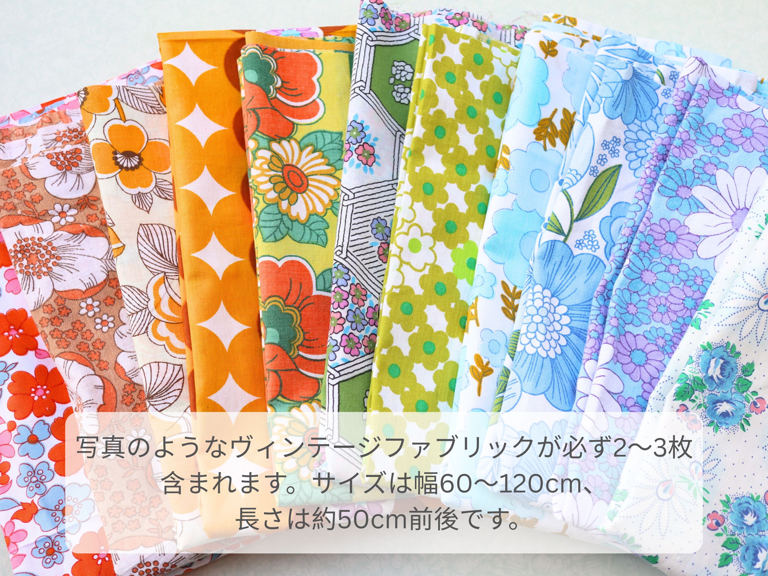 写真1枚目のような花柄のヴィンテージ生地が必ず2〜3枚以上含まれます。
