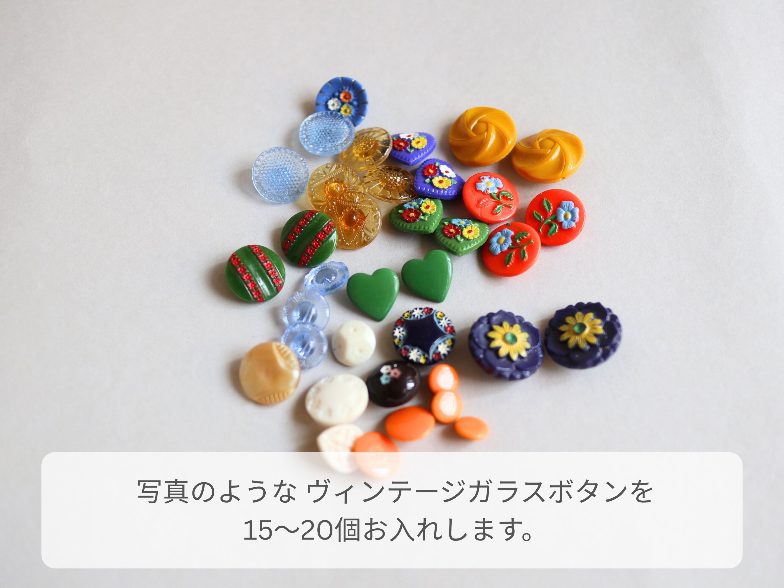 写真のようなヴィンテージガラスボタンを15〜20個お入れします。