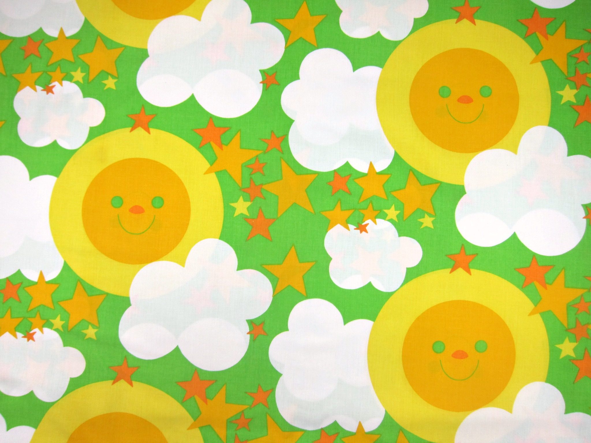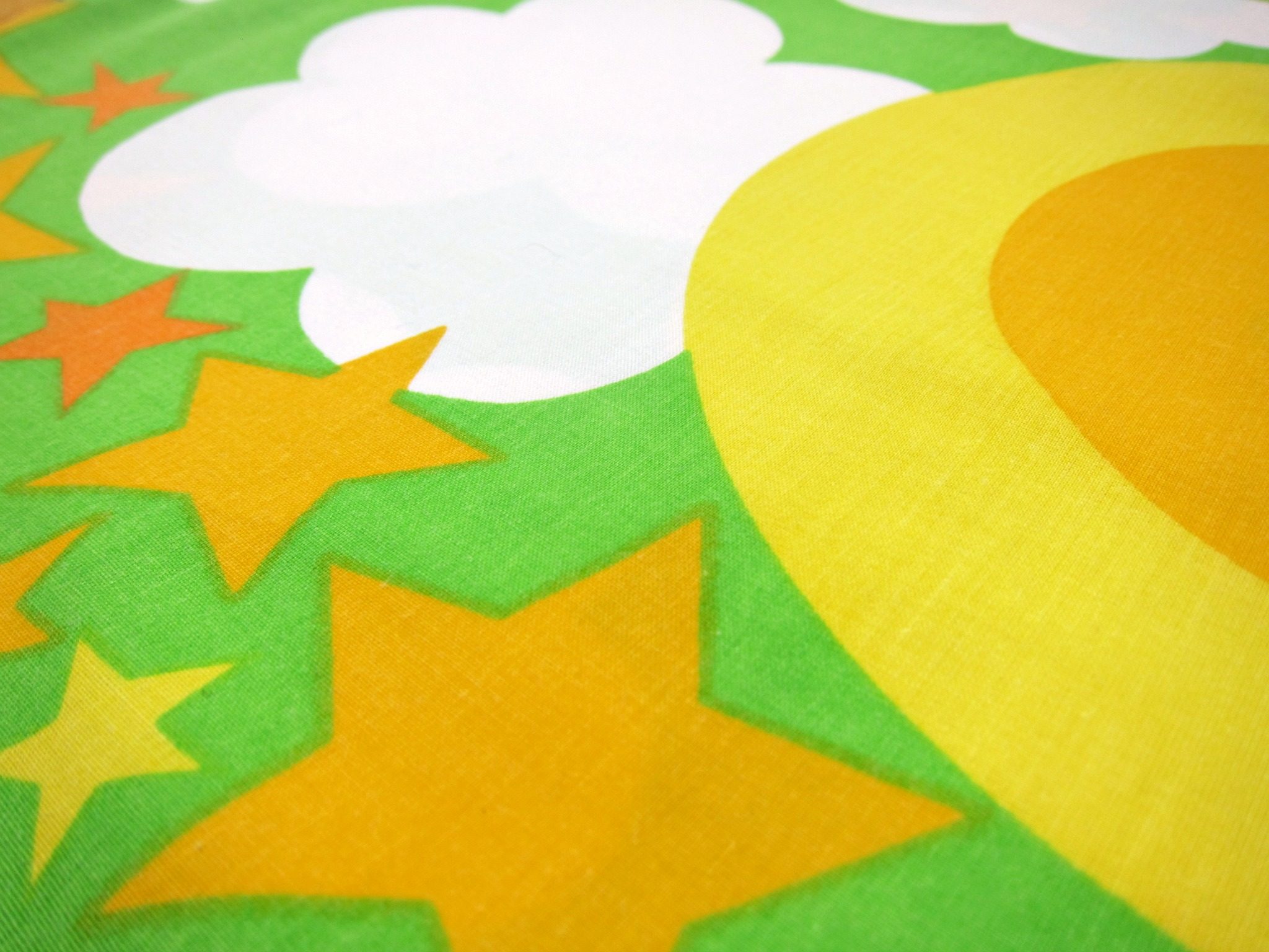 丸いお月さまとキラキラお星さま、そしてもくもく雲がグリーン色の空に浮かぶかわいいヴィンテージ生地。 レアで入手困難な柄で大変人気が高いアイテムです。