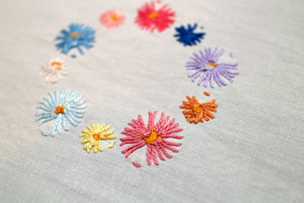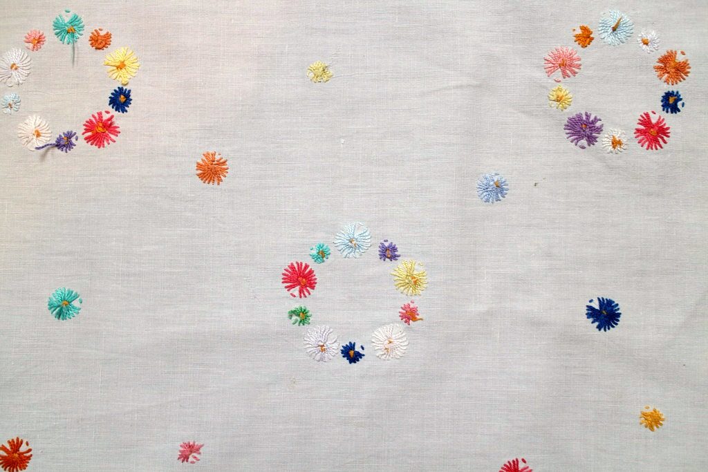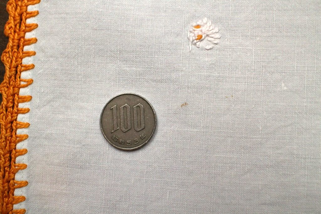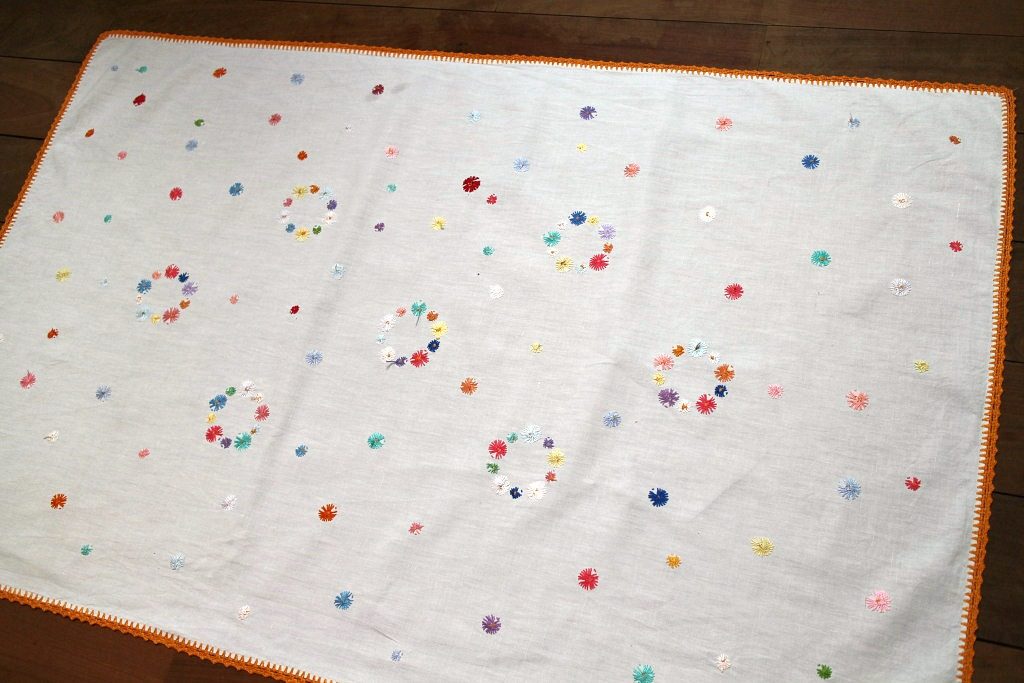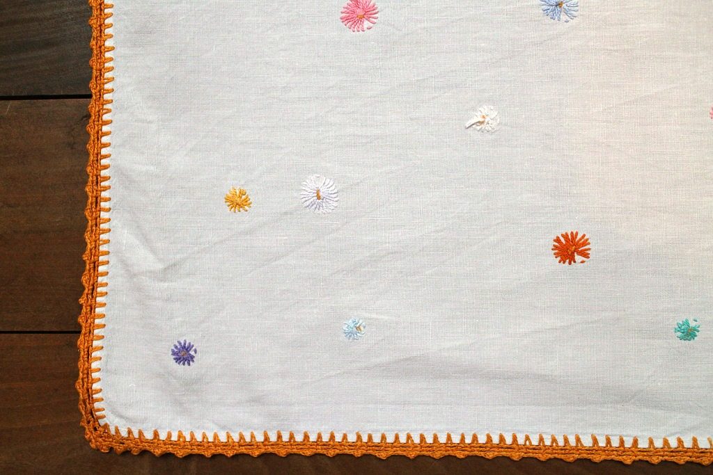 ベルリンの蚤の市で見つけたハンドメイドならではの味わいのある刺繍入りテーブルクロス。 丁寧に縫い込まれたカラフルな花モチーフが散りばめられた懐かしさいっぱいの水玉模様となっています。 ほんわかオレンジ色の縁取りステッチが手作りのぬくもりを感じさせてくれます。