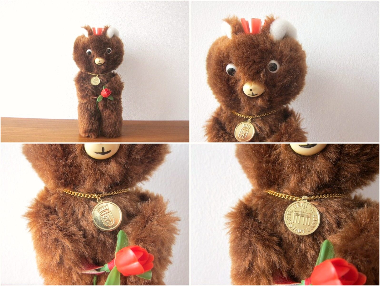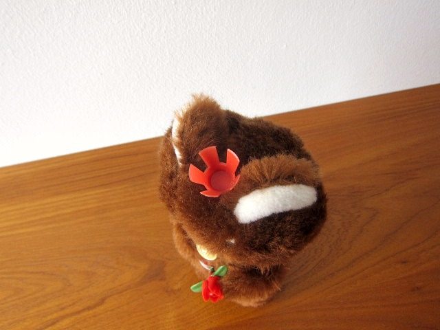 くりくりのお目目に微笑んだ表情がかわいいDDRベア、クマのぬいぐるみです。 茶色の毛並みに、小さな赤い王冠。 金貨のネックレス、そして差し出す様に手に持った赤い花がチャーミングです。 想う相手へのプレゼントでしょうか。