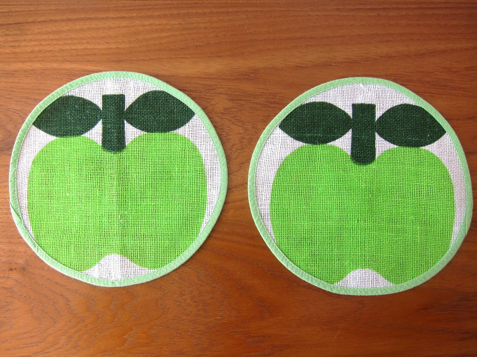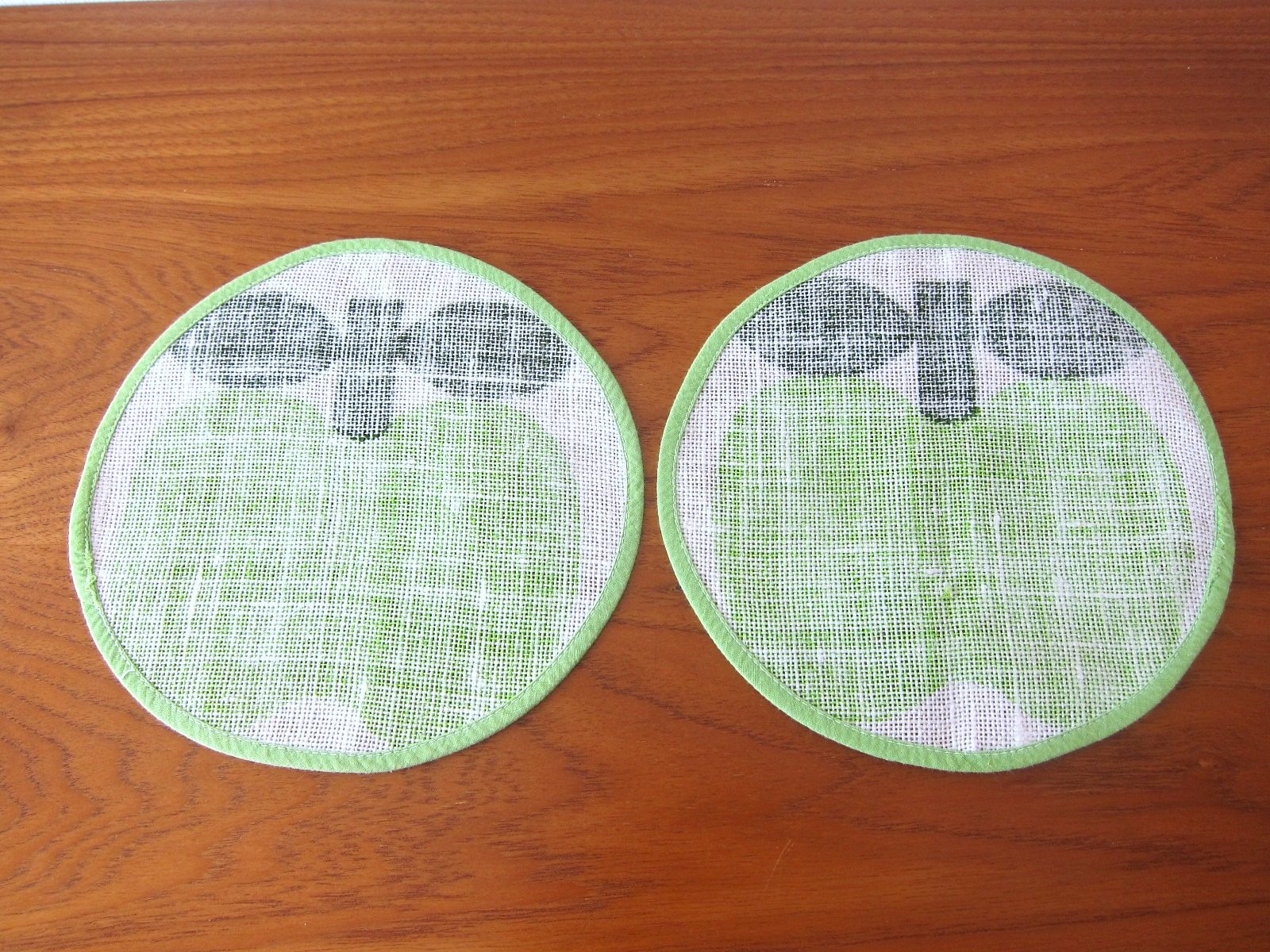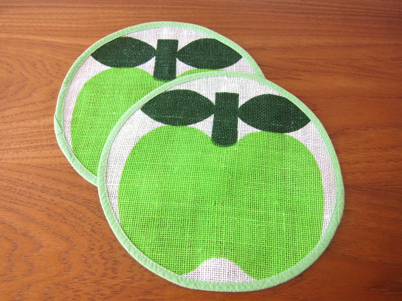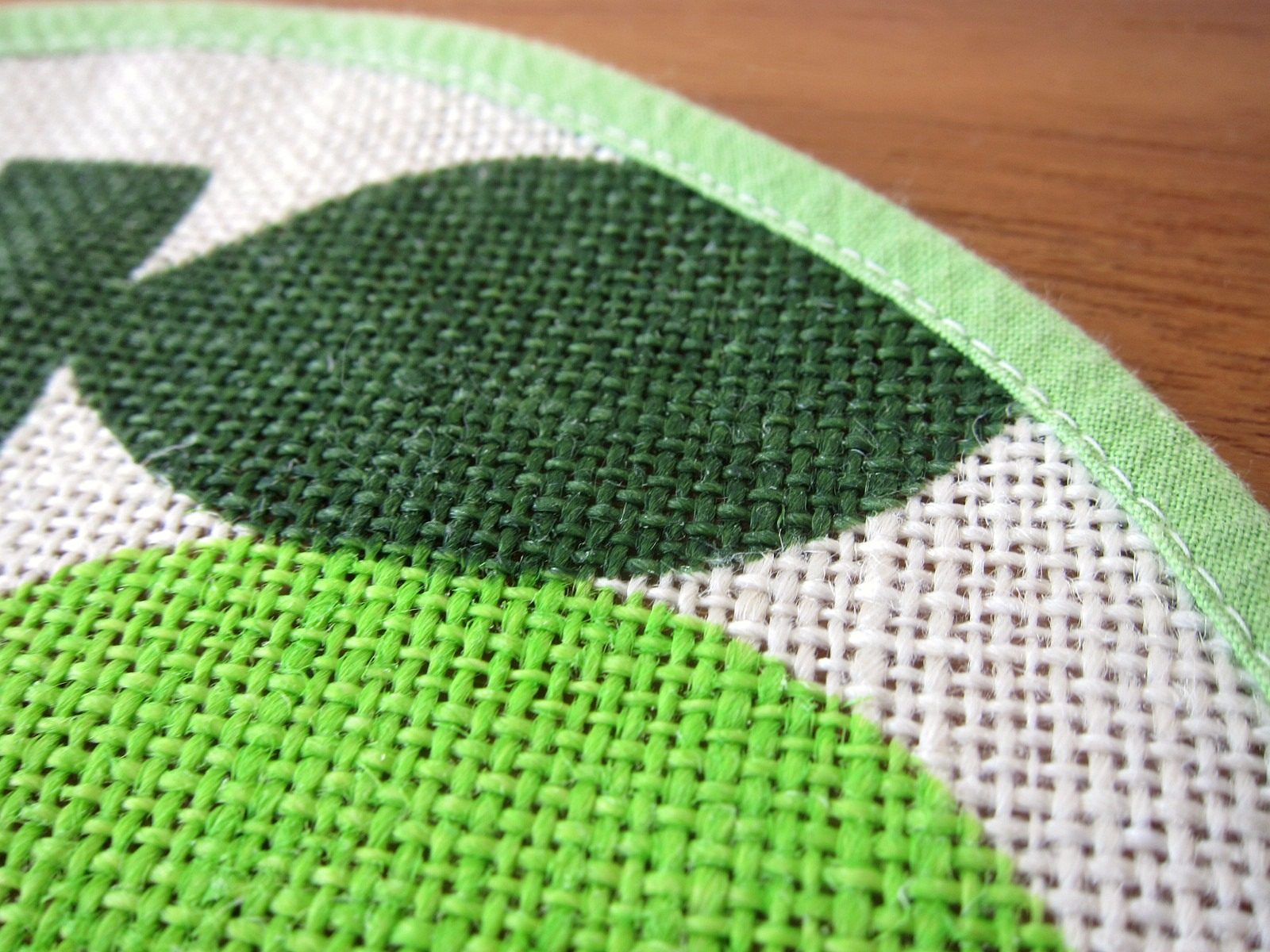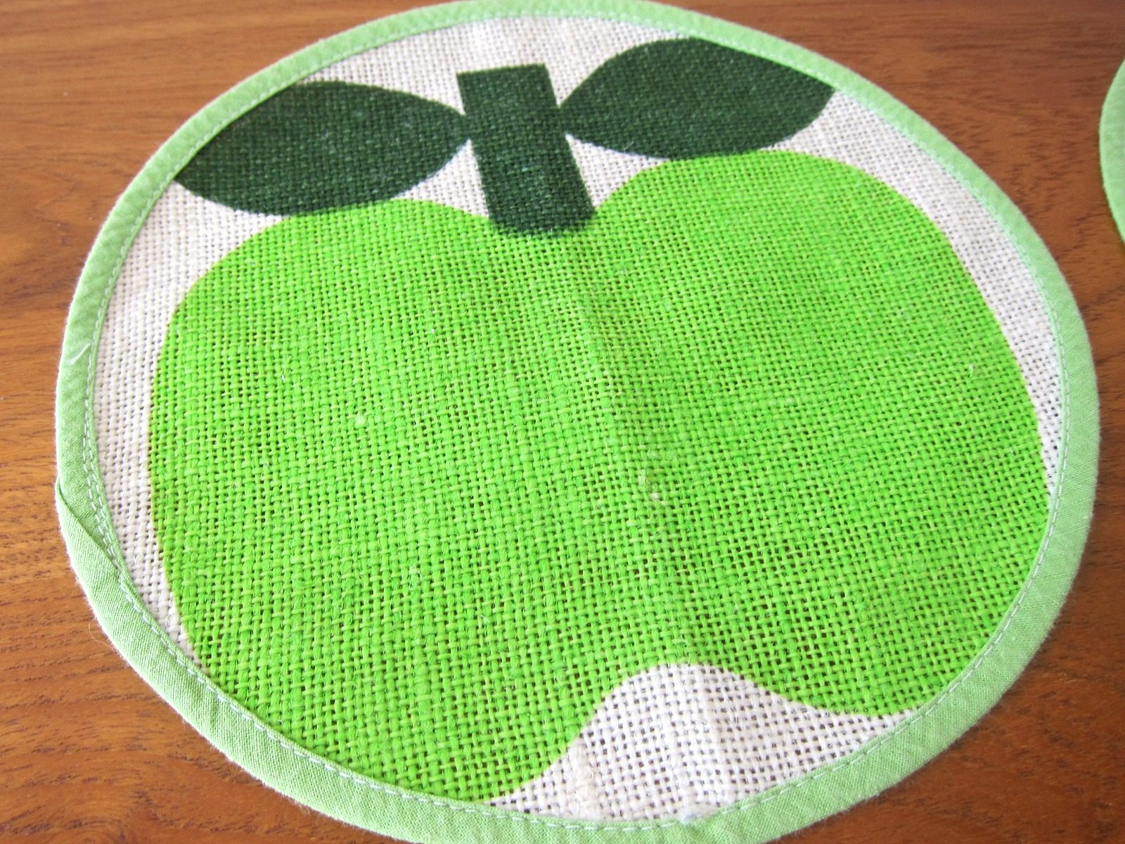 淡いグリーンでパイピングされた生地いっぱいに描かれた、ころんとした青りんごがキュートな円形マット。