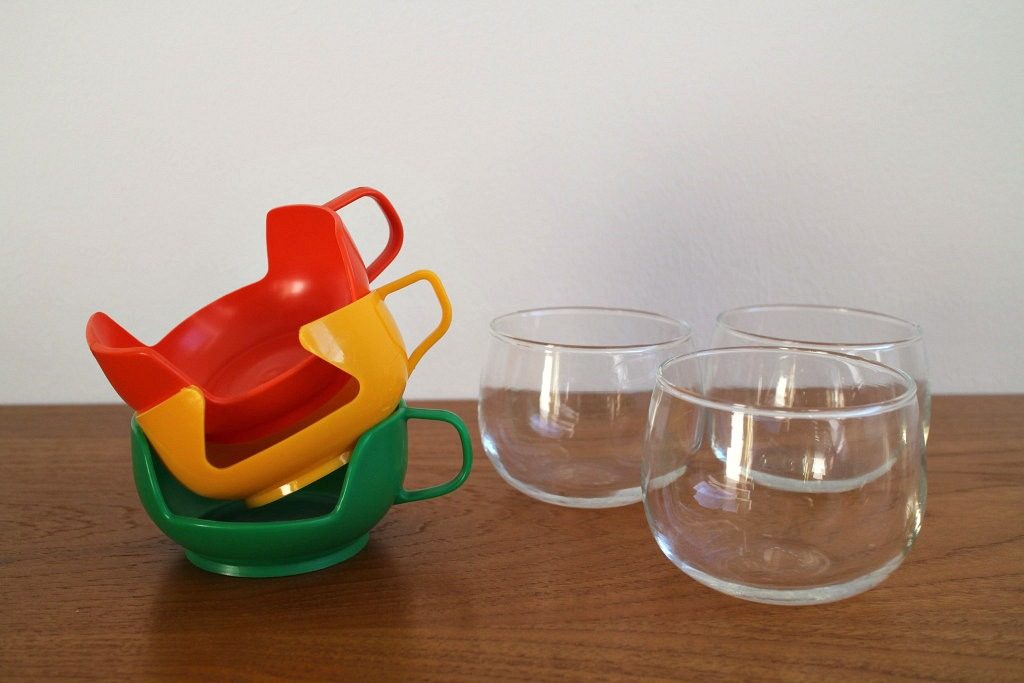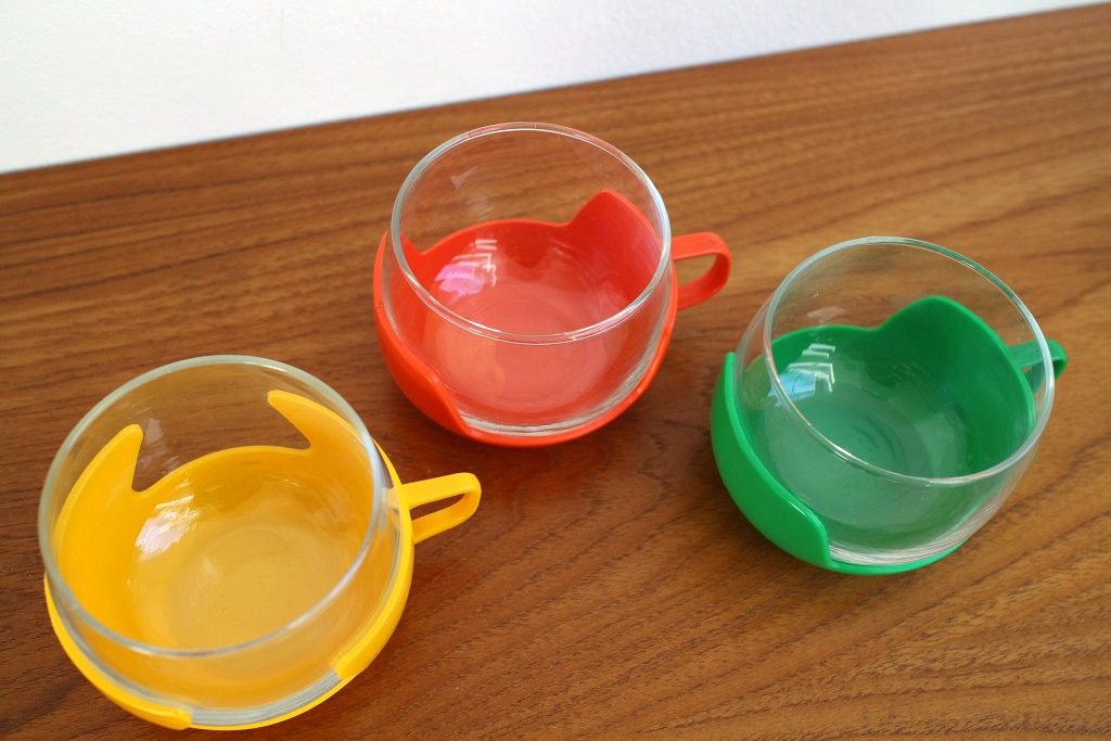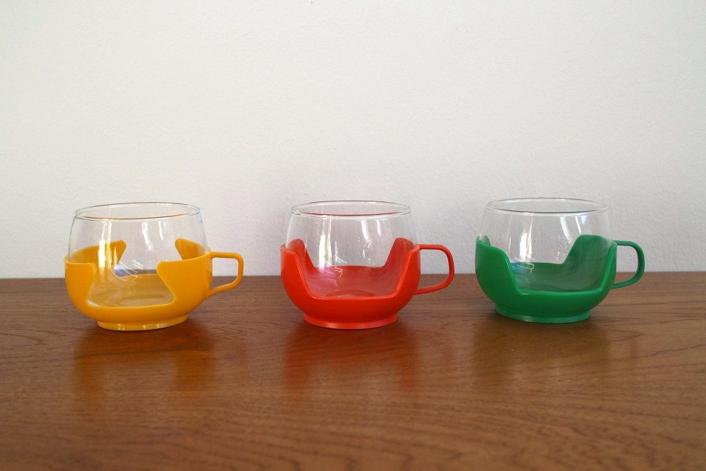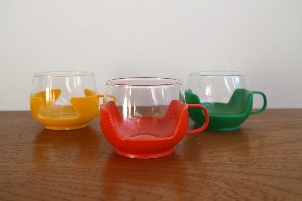 取り外し可能なプラスティクホルダーが付いたヴィンテージガラスカップ3点セット。