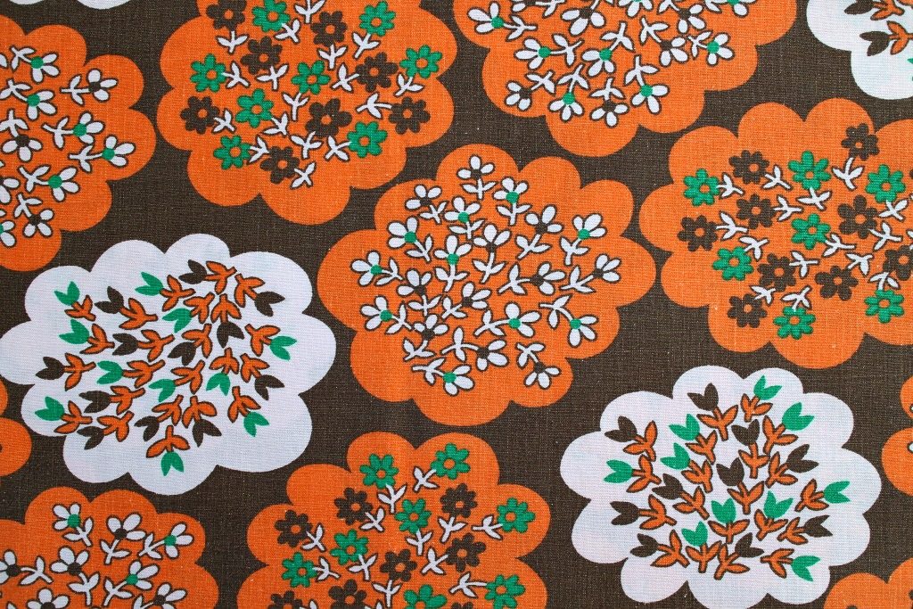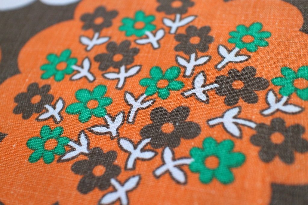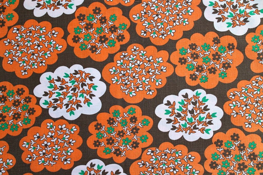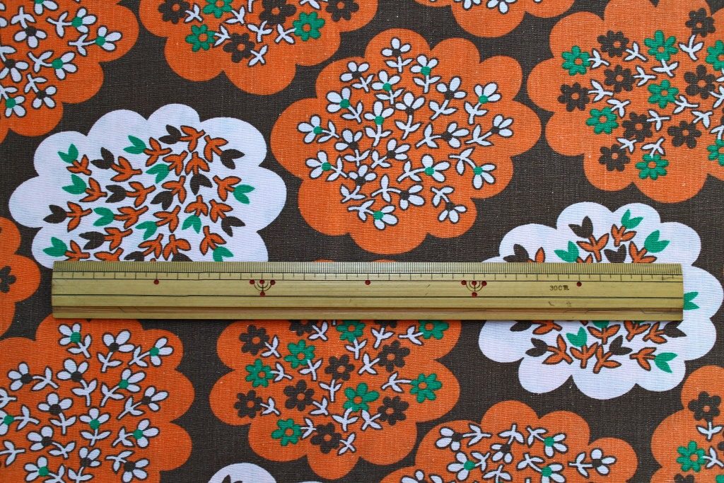 しっとり落ち着いたブラウンをバックにオレンジのモコモコ型フラワーモチーフが広がった、温かみのある優しいレトロ生地。