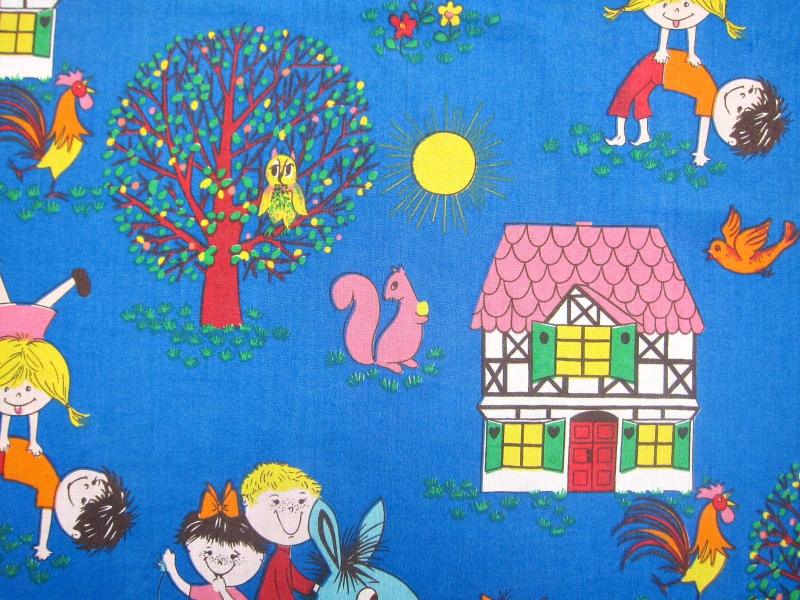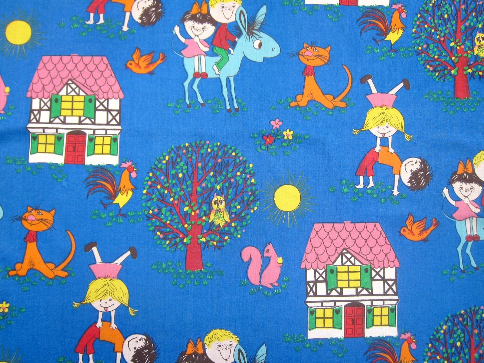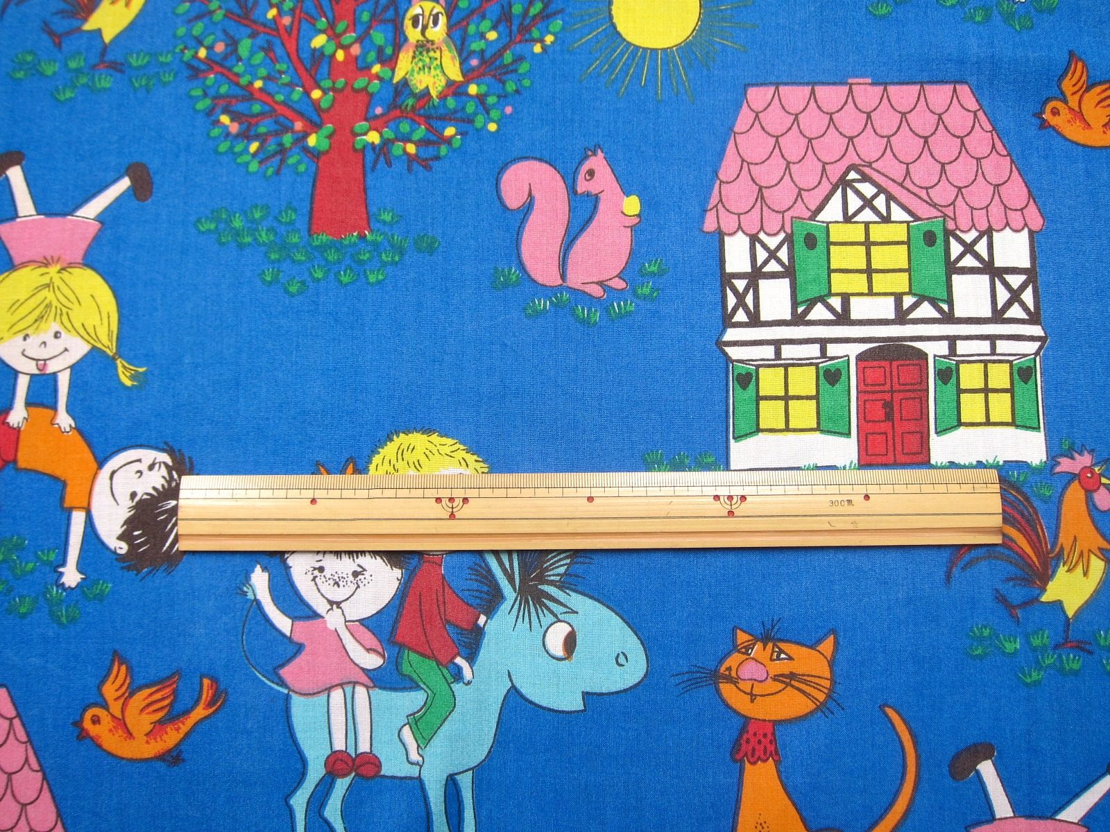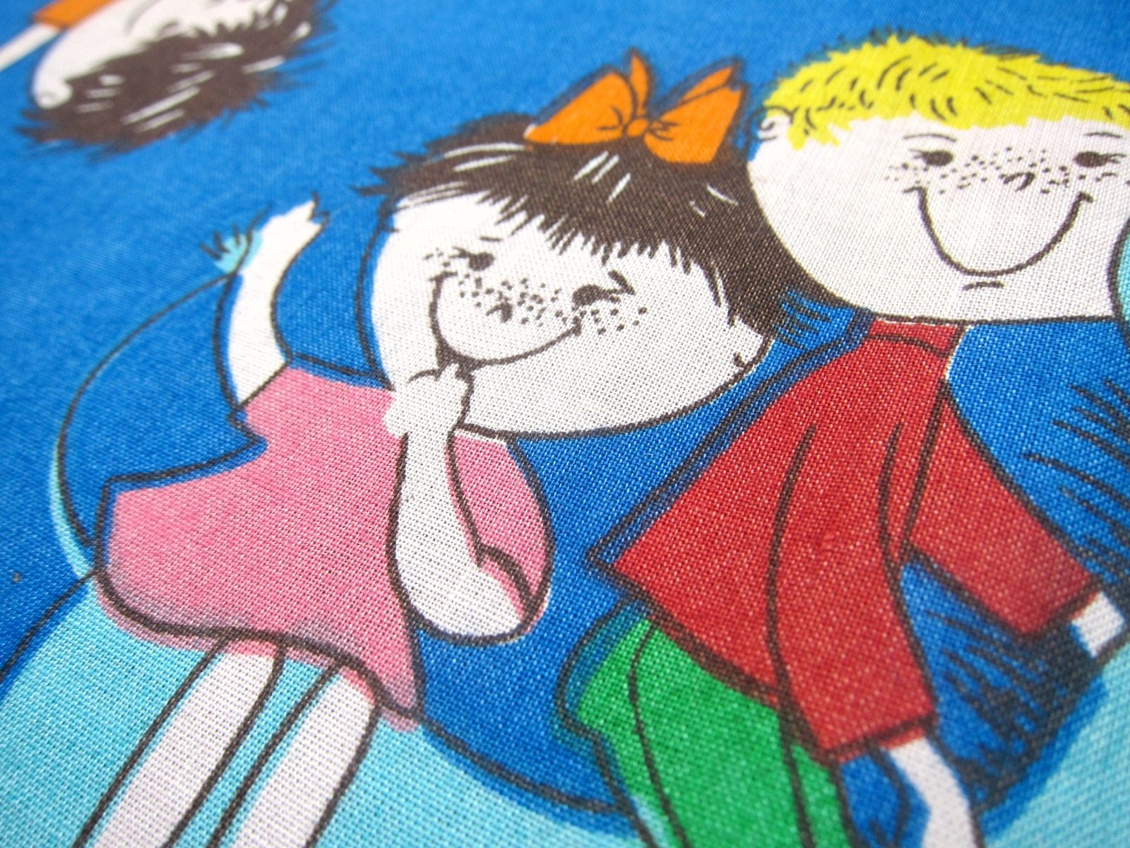 コンテンツにスキップロバにまたがったり逆立ちしたりの元気な子どもたちや、猫や鳥などの動物が描かれたレトロな青いファブリック。