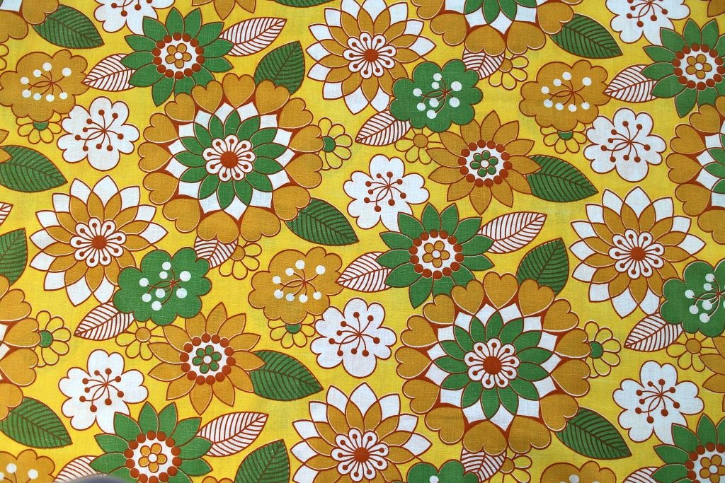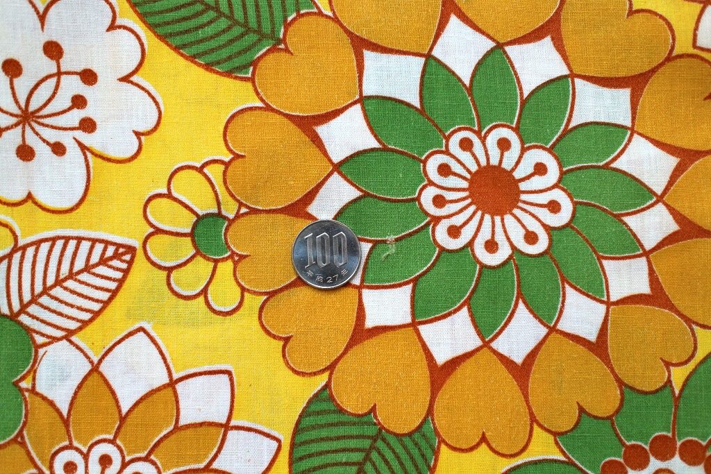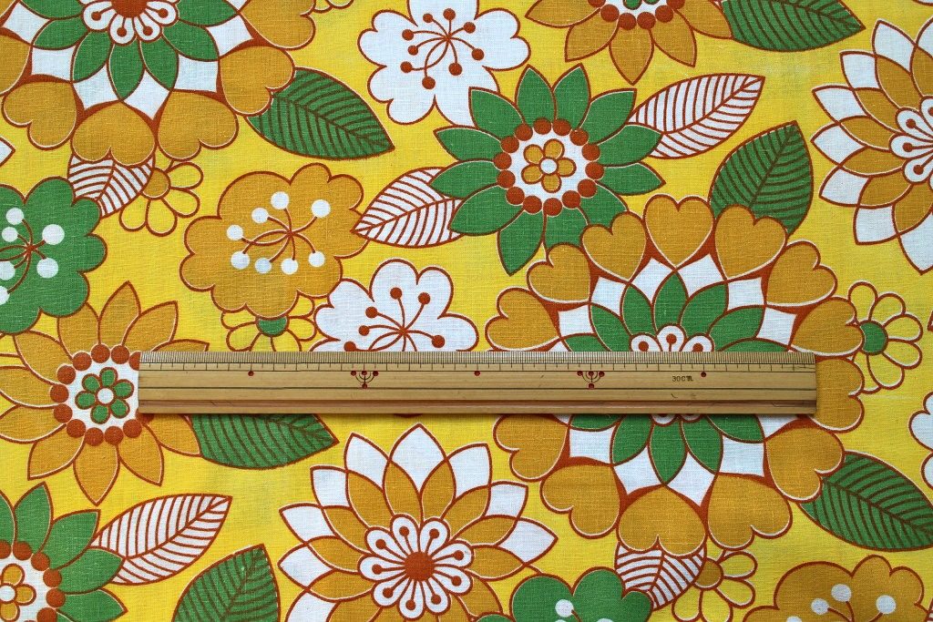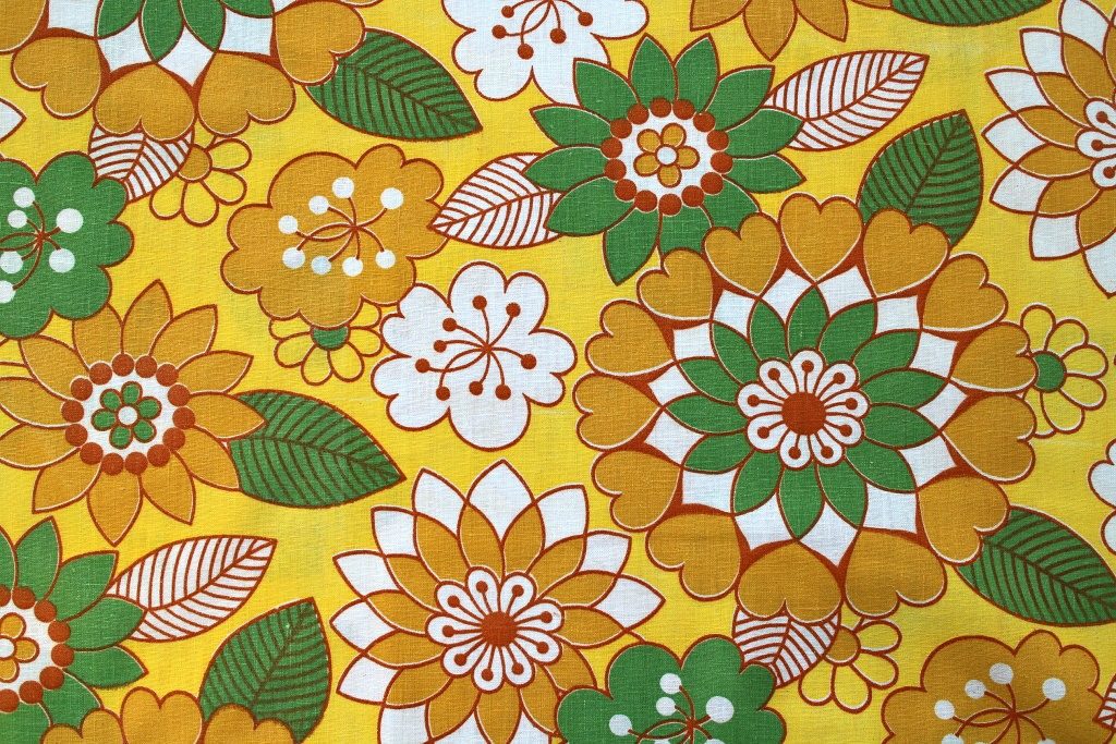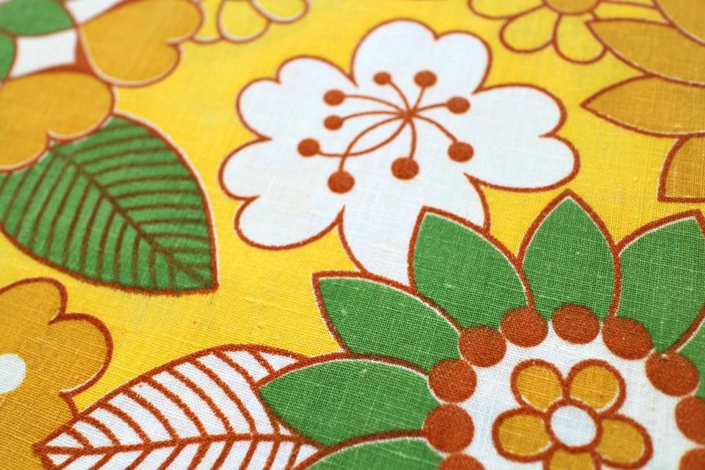 コンテンツにスキップスピログラフで描いたようなフローラル模様が広がるイエロー系レトロ生地。