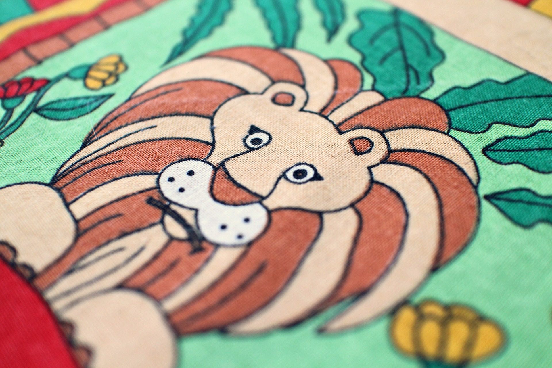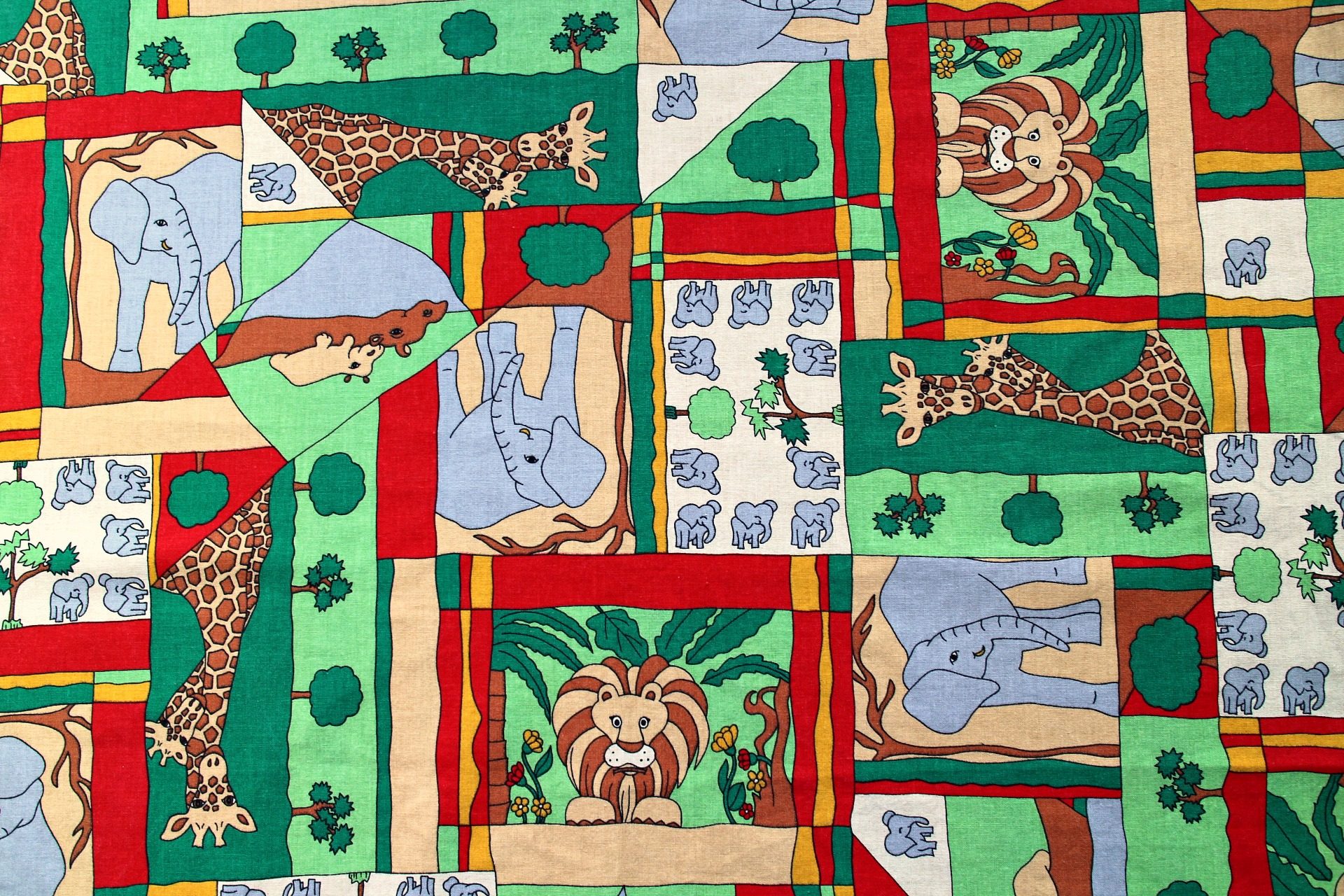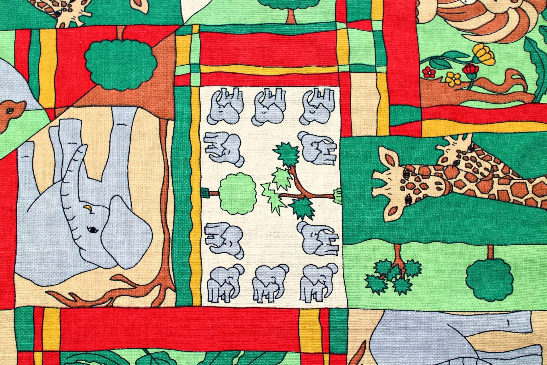 ライオンにキリン、ゾウにカバなどの動物プリントがパズルのように嵌めこまれたヴィンテージファブリック。