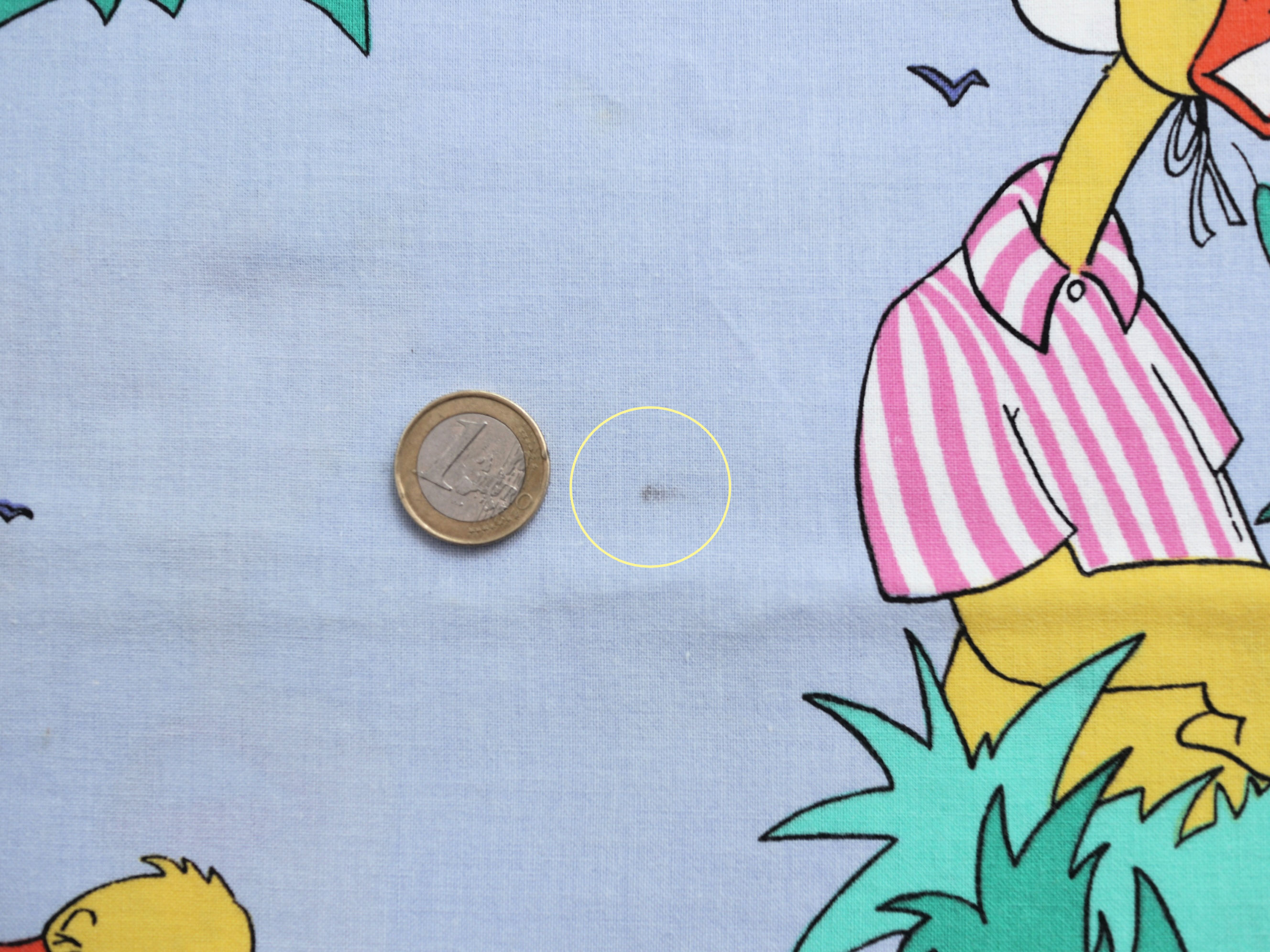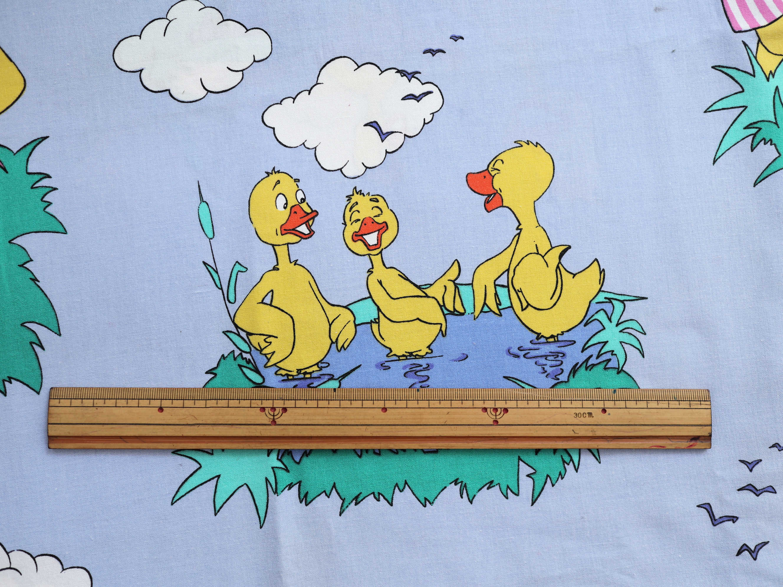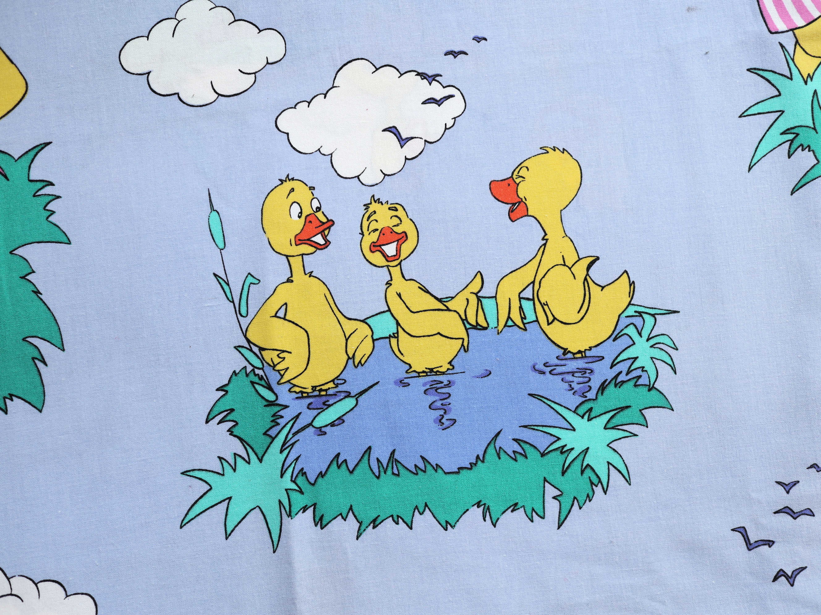 かわいいアヒルの親子が描かれたコットン生地。水辺で遊ぶ様子が微笑ましいイラストで、子ども部屋や小物作りにぴったりです。ポーランドで見つけたヴィンテージ。小さな汚れが一部にありますが、全体的に良好なコンディション。