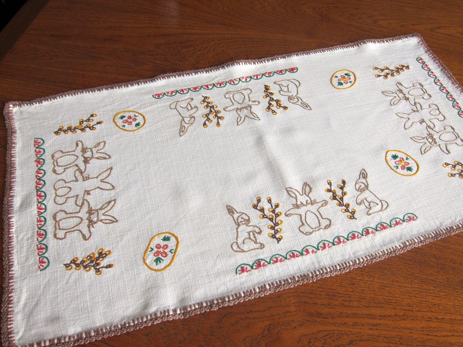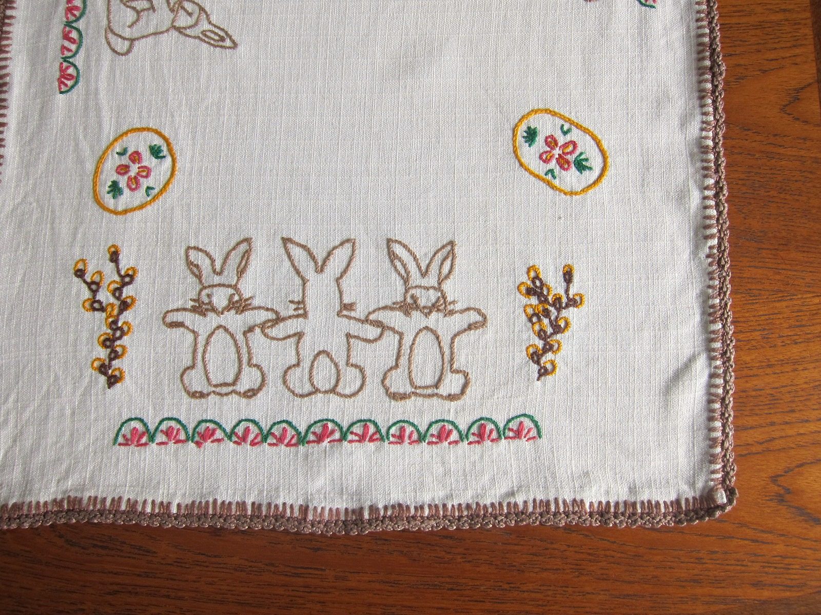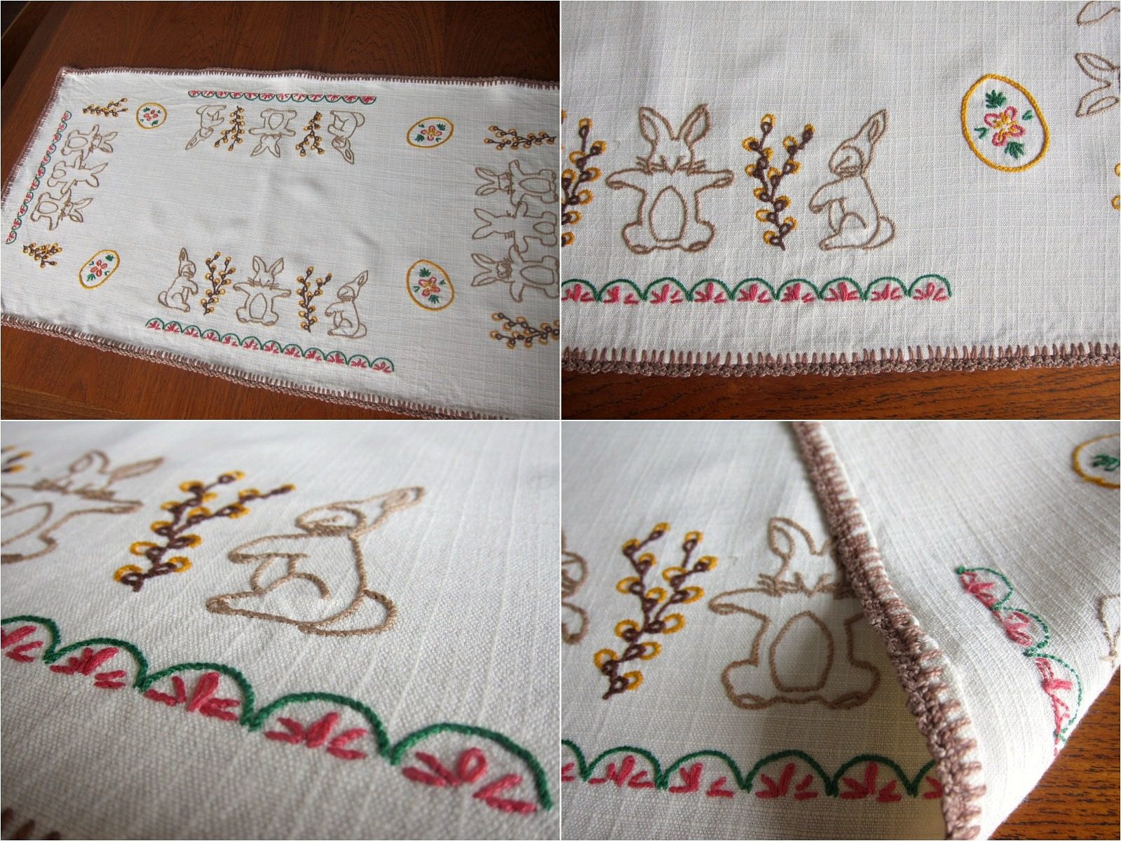 イースターにちなんだ、卵やうさぎがハンドステッチで施されたレーヨンクロスです。