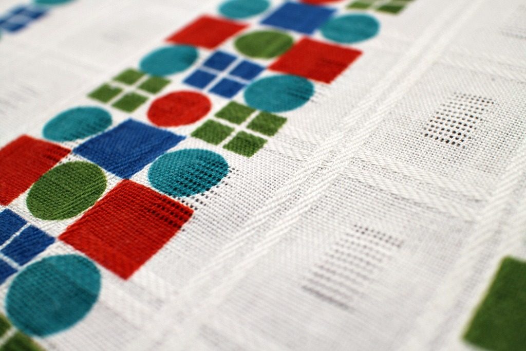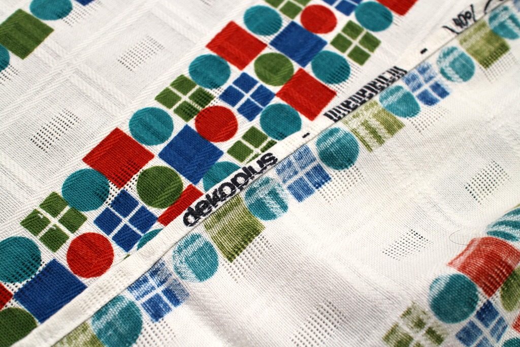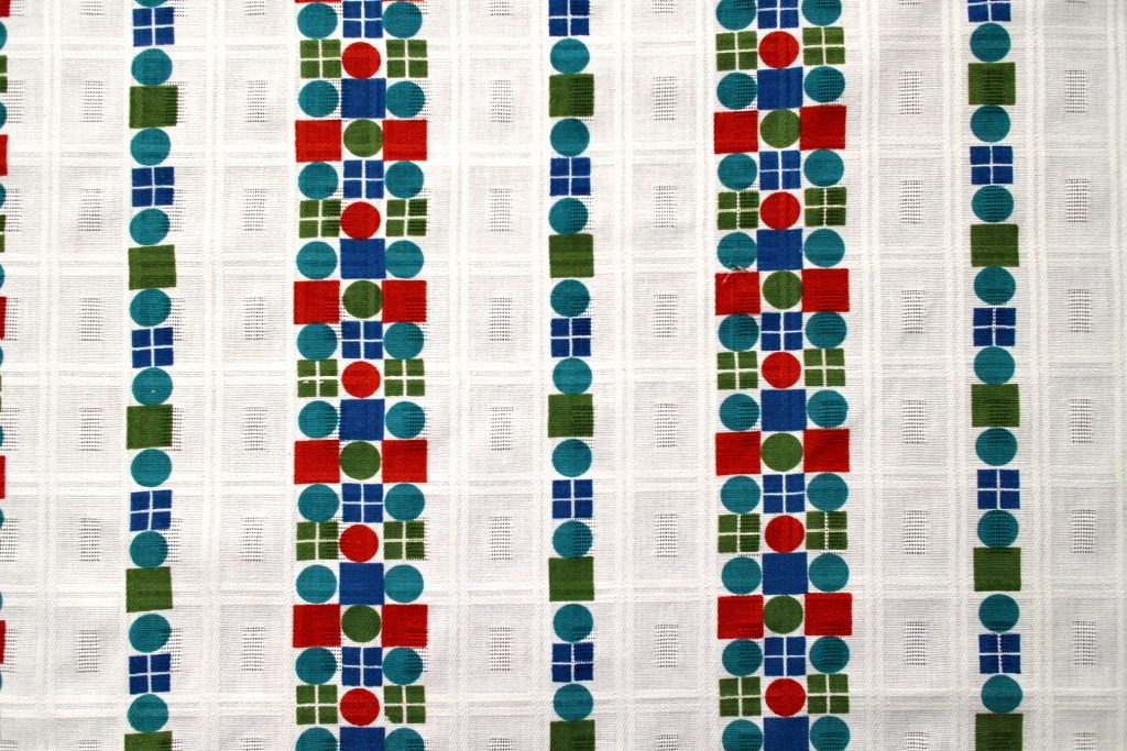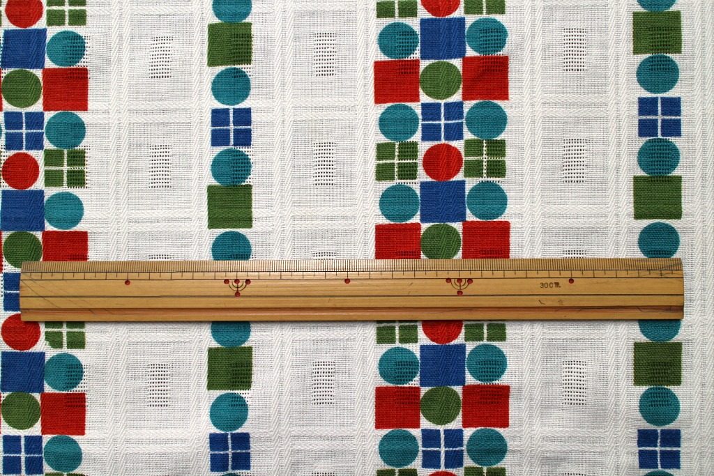 コンテンツにスキップオランダ発のDekoplus、赤や青・緑の丸と四角が並んだカラフルな幾何学模様のヴィンテージファブリック。