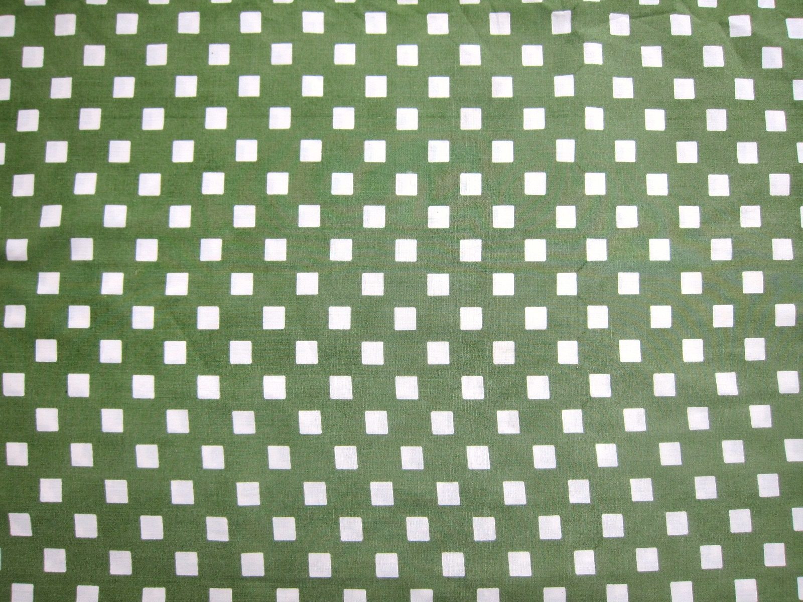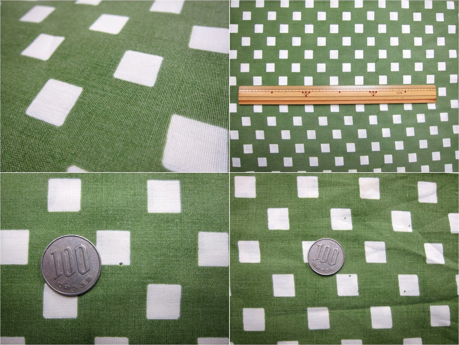 落ち着いたカーキ色の渋くてオシャレな市松模様風ビンテージ生地。 白い小さな四角が並んでいます。