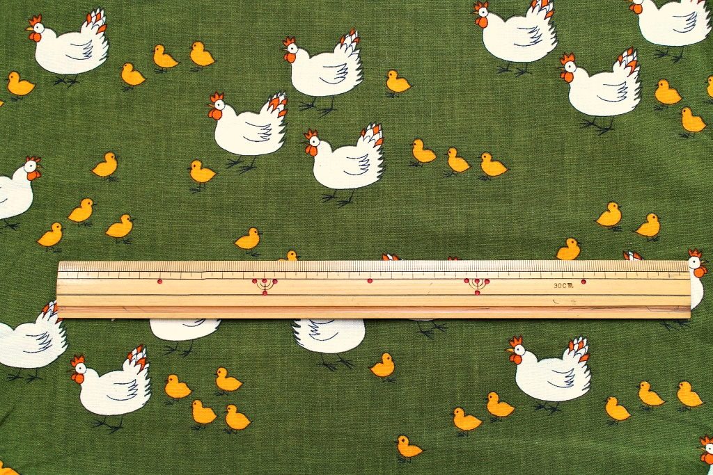 1. 人気のにわとり柄(黄緑) サイズ: 38cm x 56cm