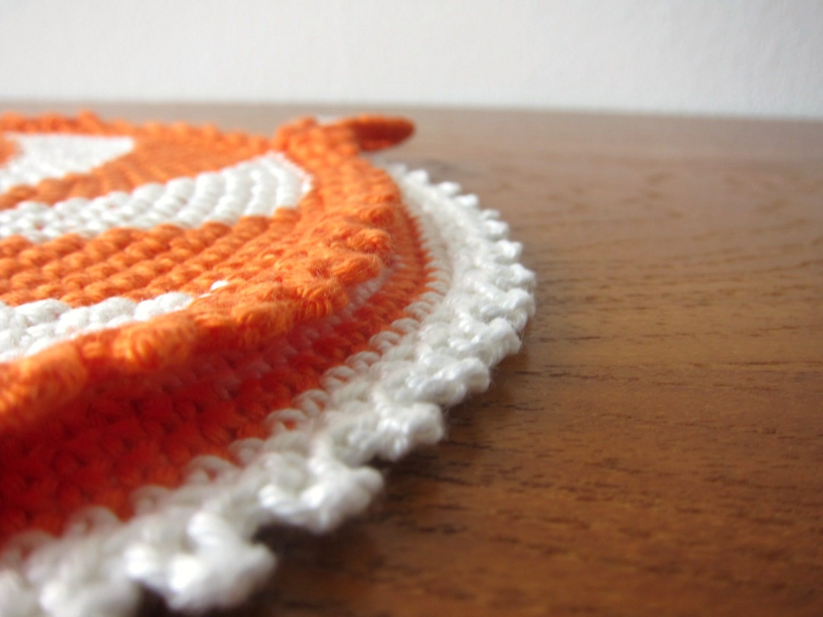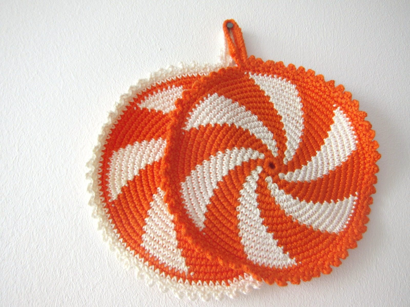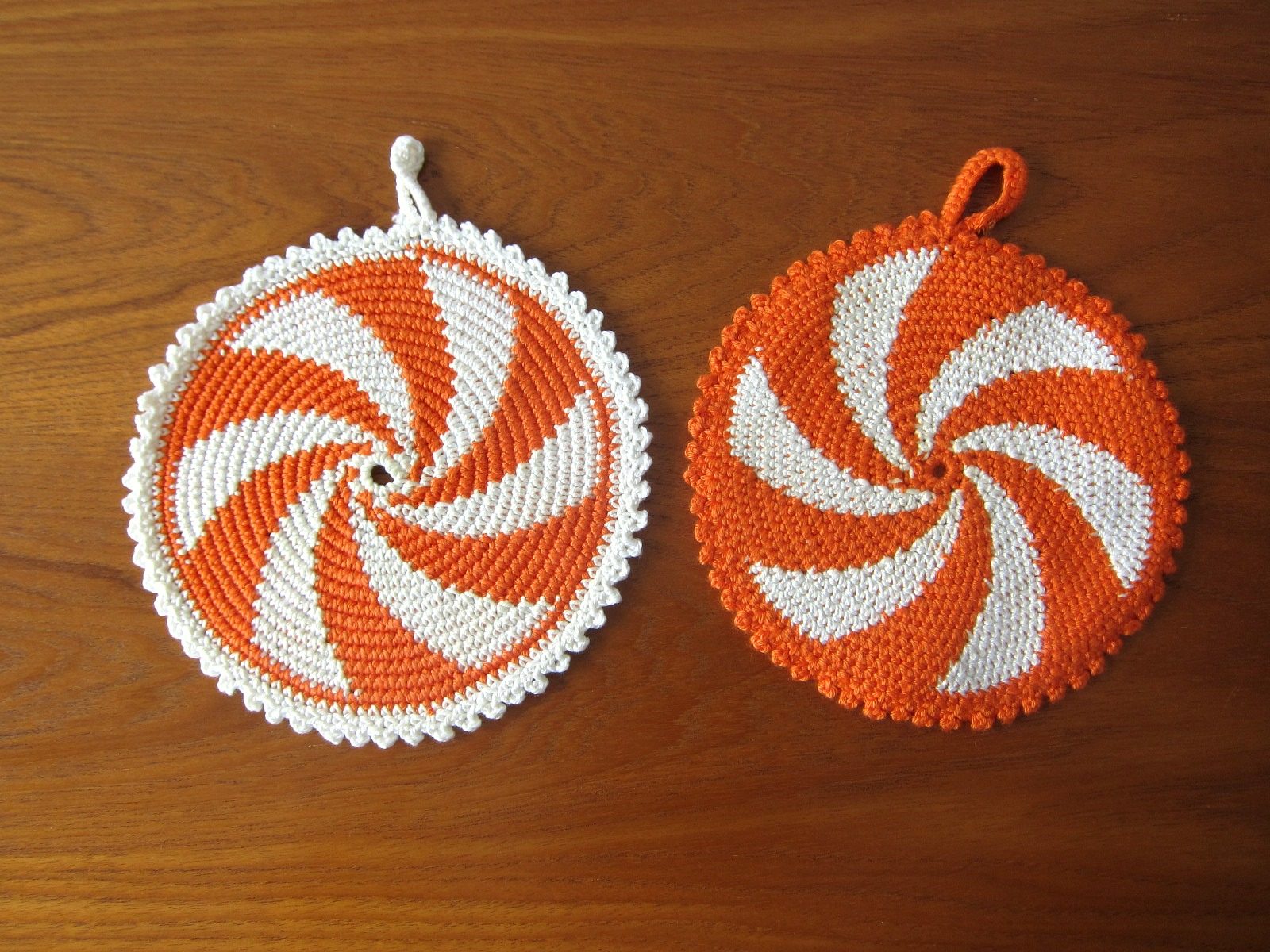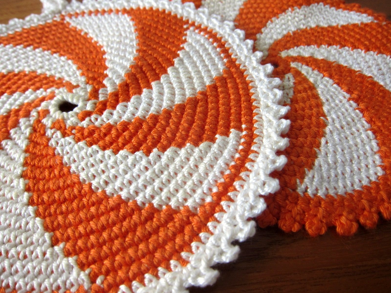 コンテンツにスキップオレンジと白のらせん模様がレトロなハンドメイド鍋つかみ2点セット