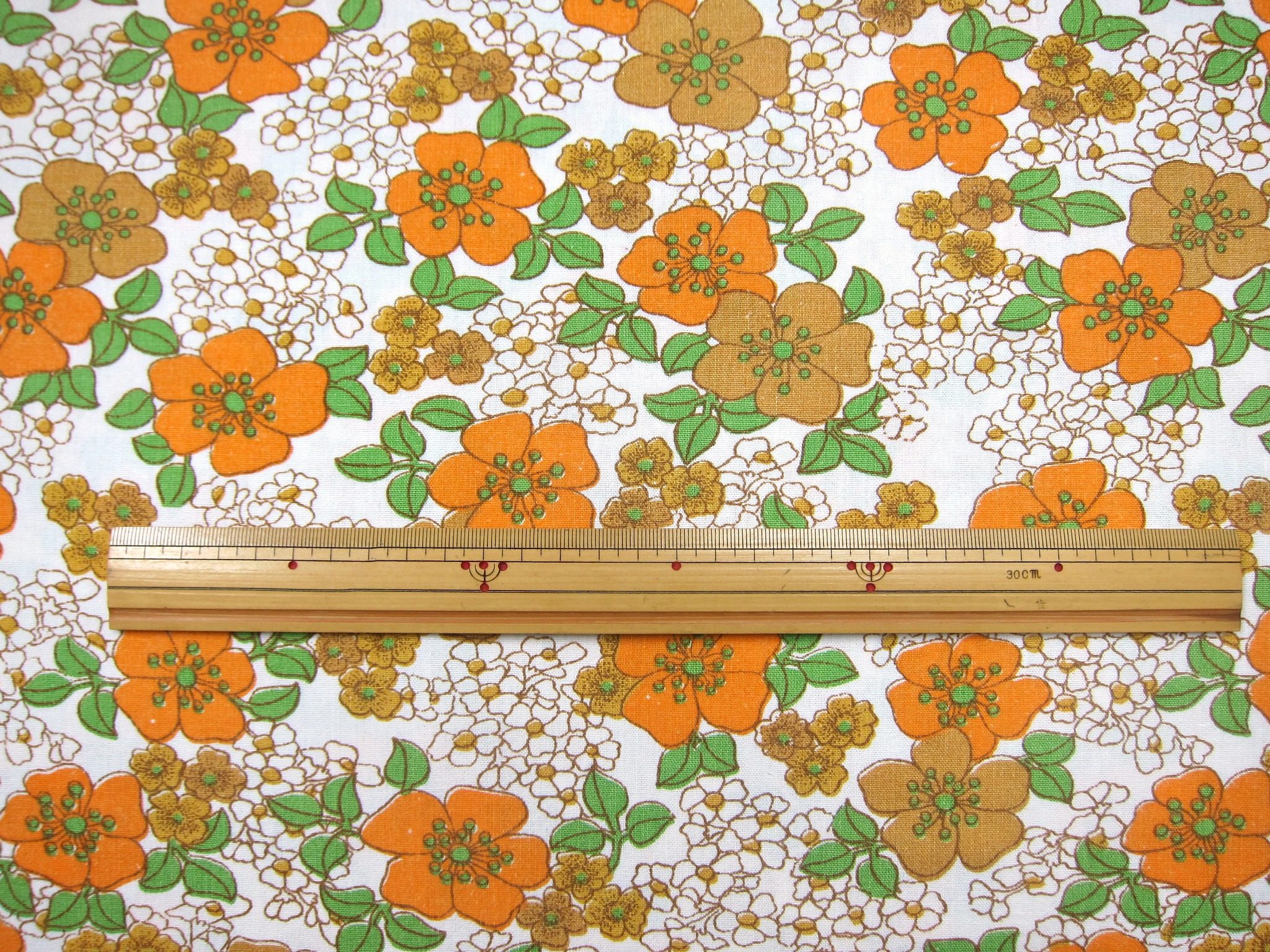 コンテンツにスキップオレンジと薄茶色の優しい色合いを基調とした花柄に、緑の葉模様のアクセントが美しいコットン製ビンテージファブリック。