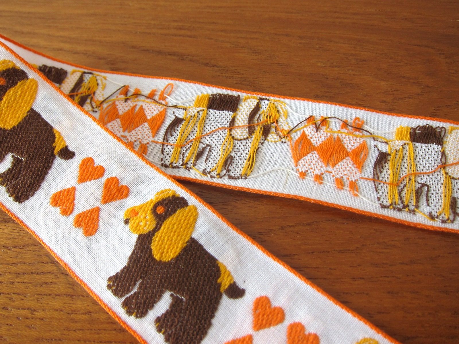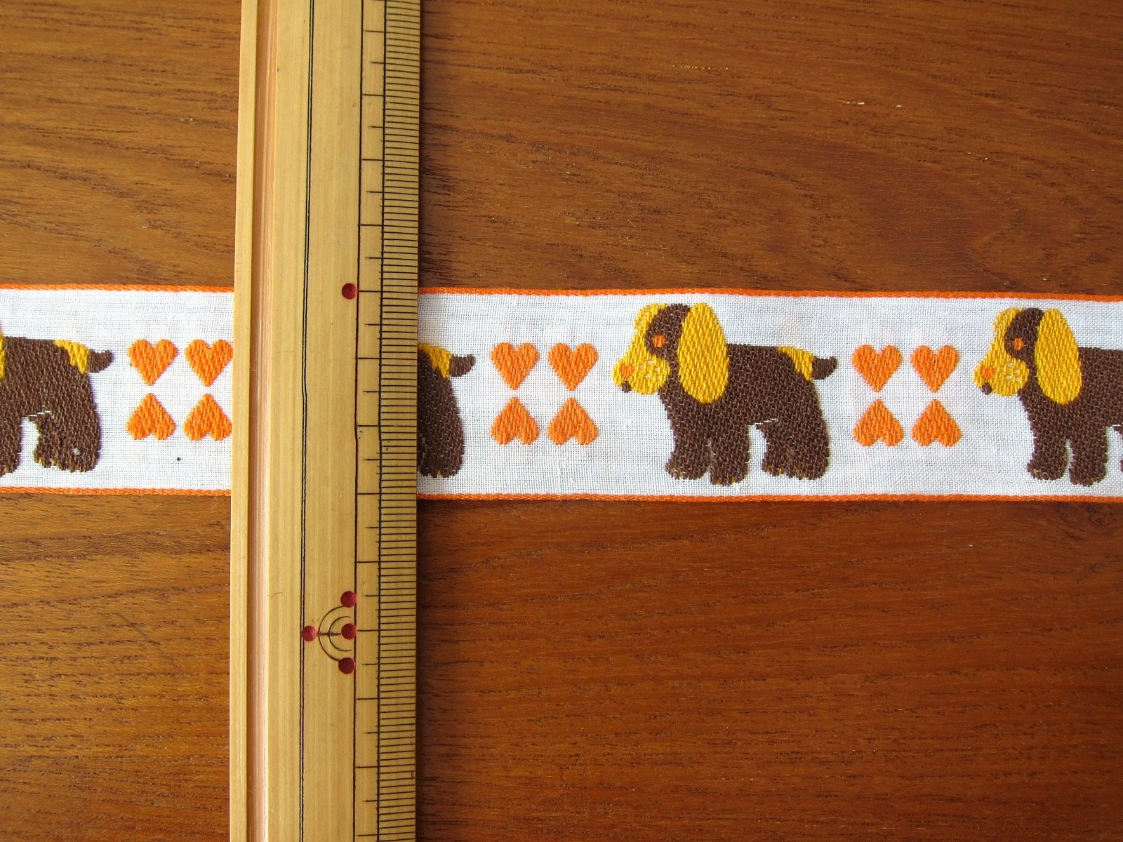 白のベースにオレンジ色のハートと茶色の犬が刺繍されたヴィンテージのチロルテープです。 オレンジ色のハート柄は4つ一組で、犬の柄と交互に配置されています。 テープの縁もハートと同じオレンジ色の縁取りがされていて、全体として優しい色合いにまとまっています。