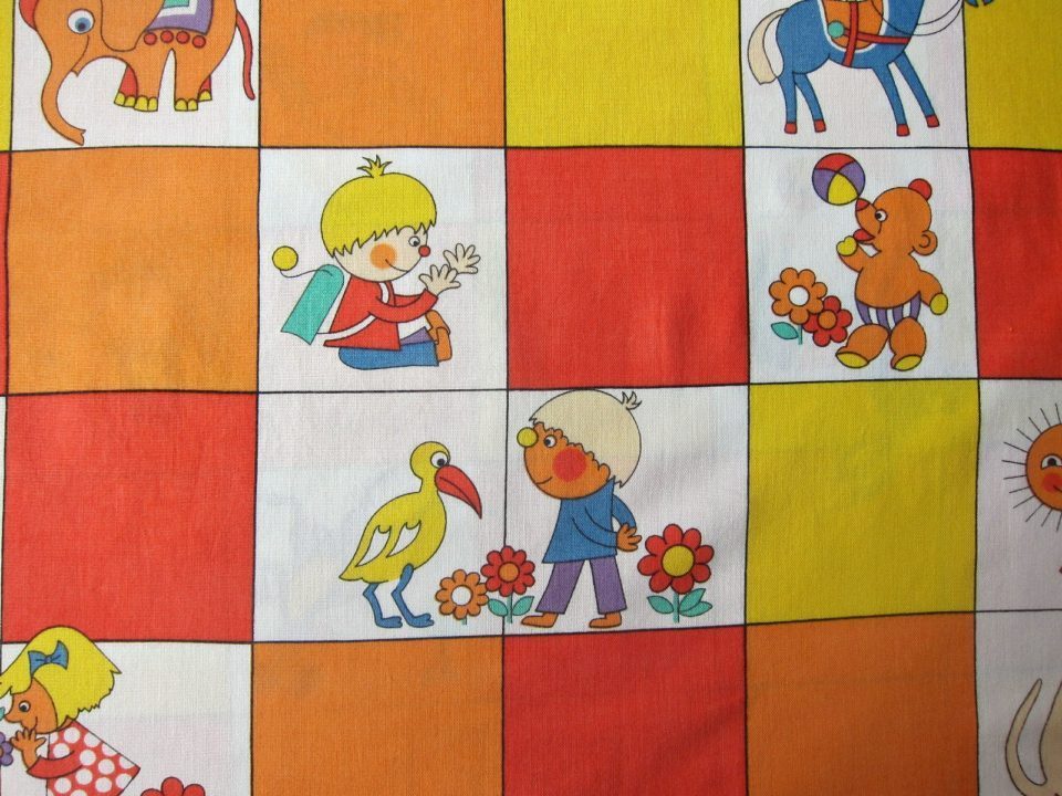 かわいい子どもや動物などのイラストの70年代レトロ生地。 オレンジや黄色などの碁盤のマスにかわいく描かれています。