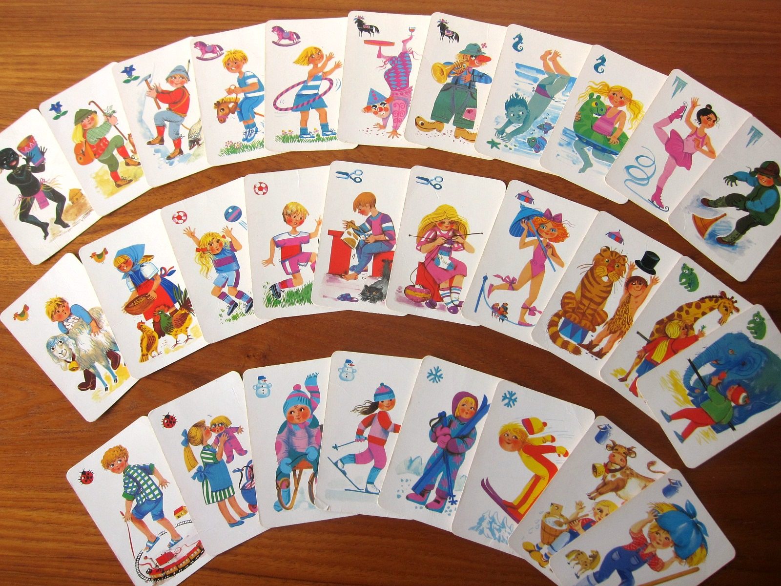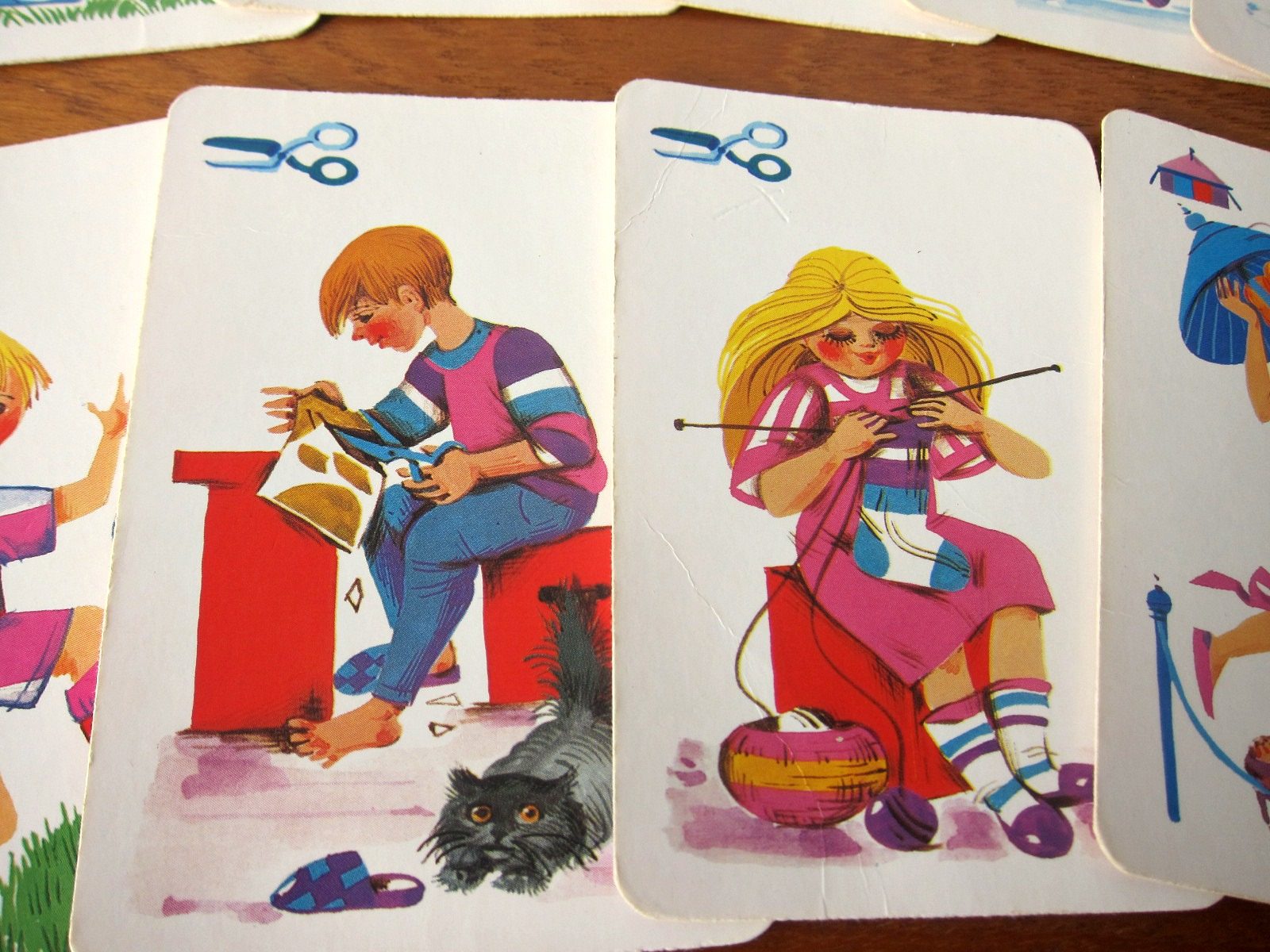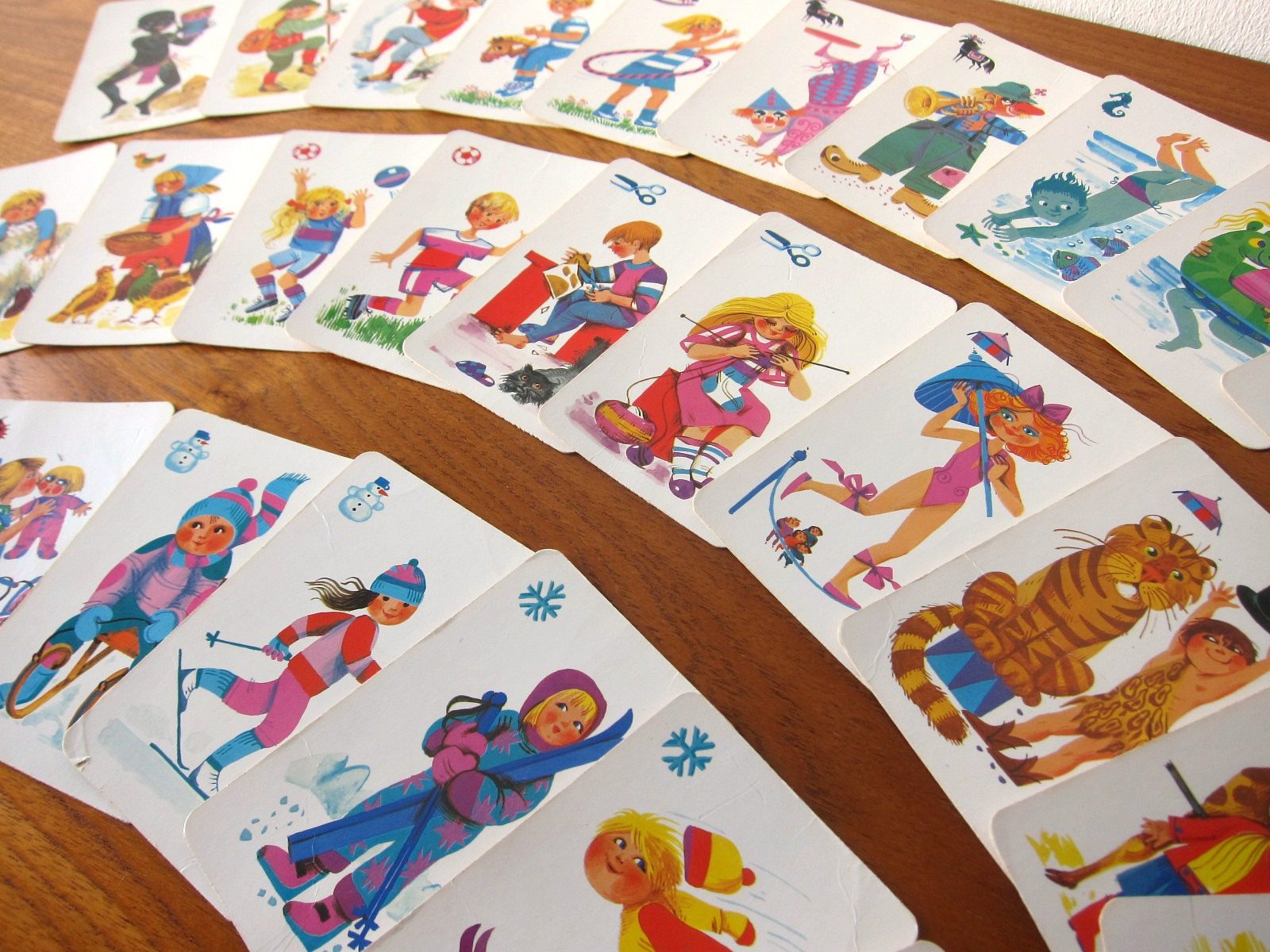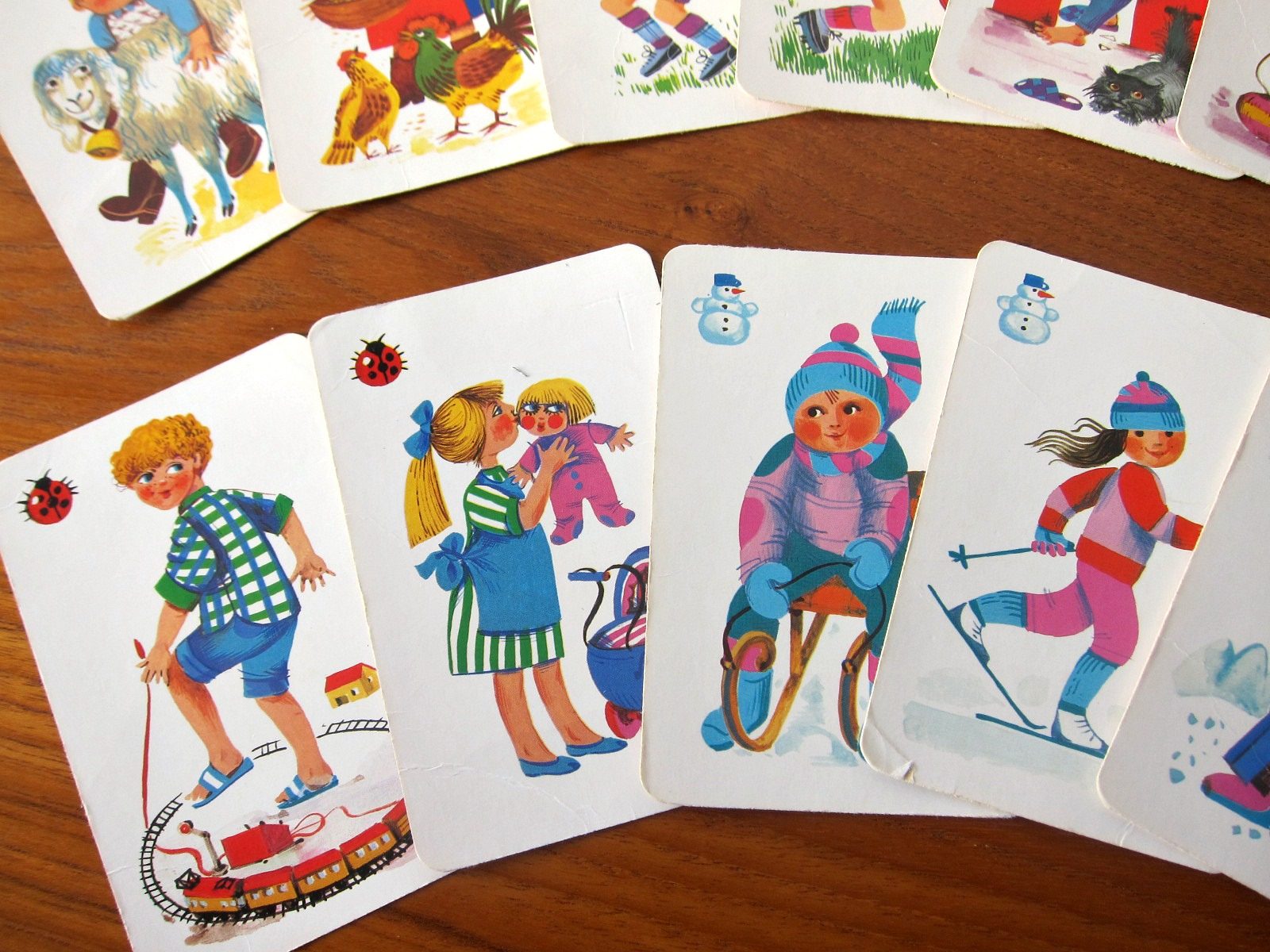 さまざまな遊びや日々の生活を描いた知育カードゲーム。 絵合わせゲームでしょうか。 子どもたちの生き生きとした様子がノスタルジー溢れるタッチで描かれています。