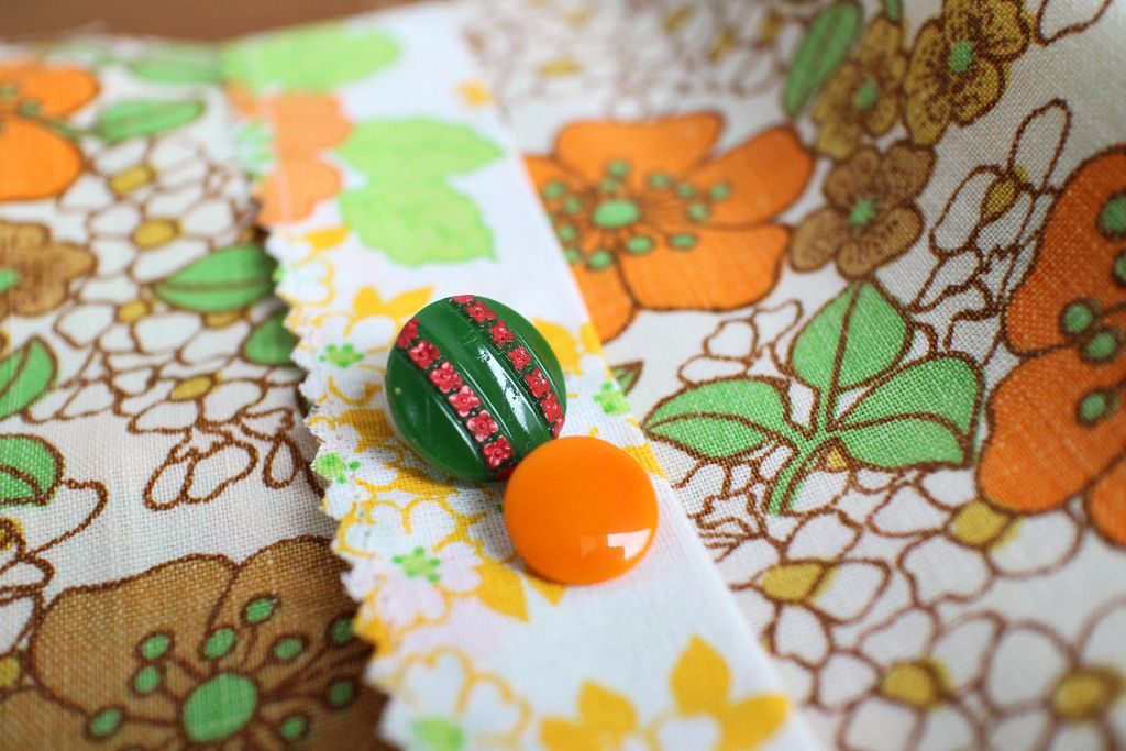 ガラスボタン付きウォームカラーのレトロ布はぎれ10枚セット