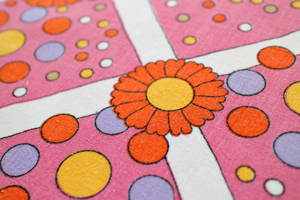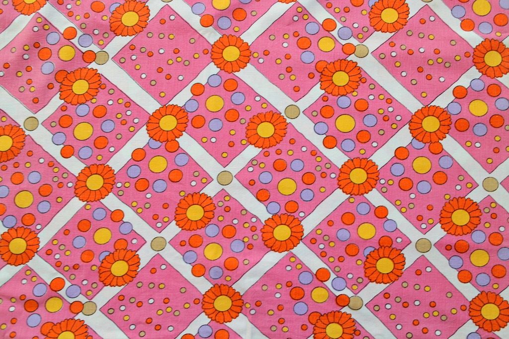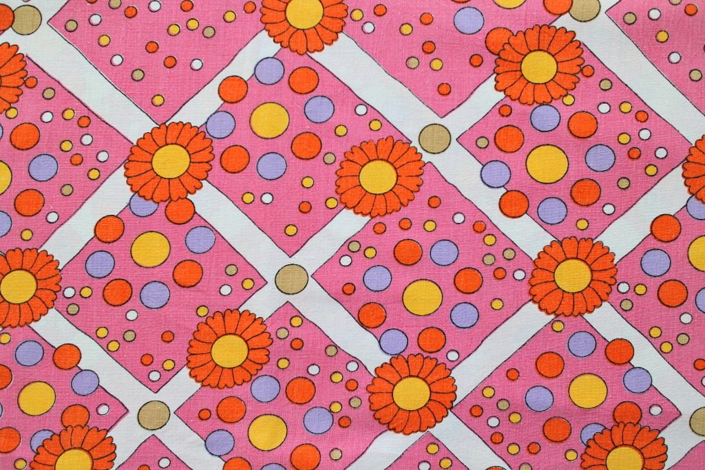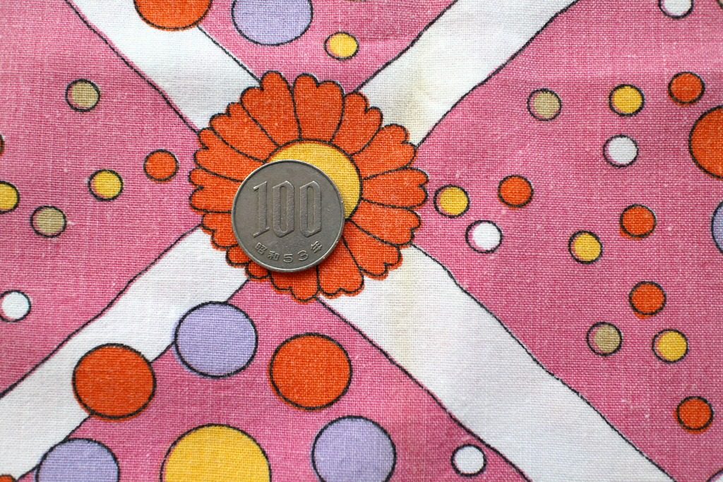 コンテンツにスキップラブリーなお花たちが格子状の白線に並んだピンクのヴィンテージコットン生地。