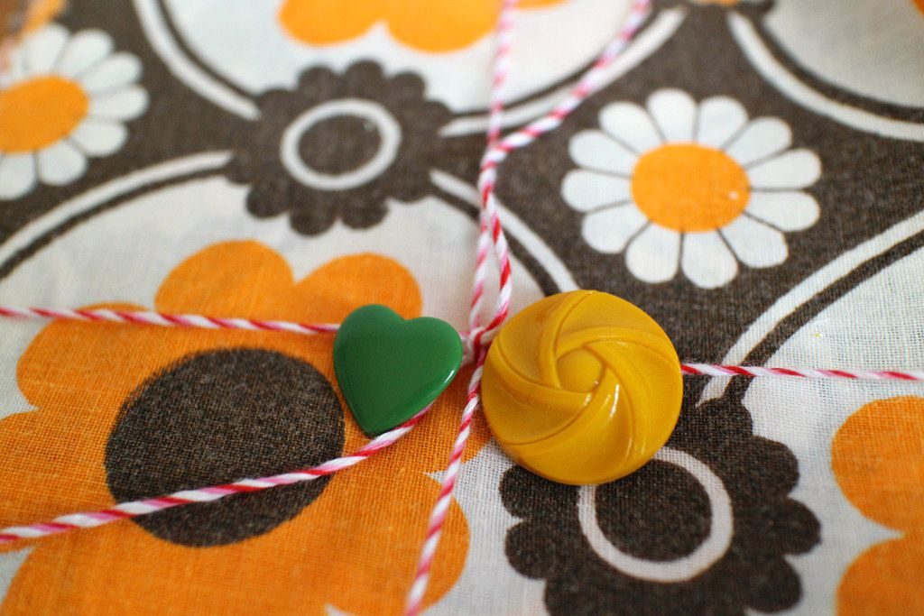 グリーンのハートと丸いフラワー型のガラス製ヴィンテージボタン2つ付き。