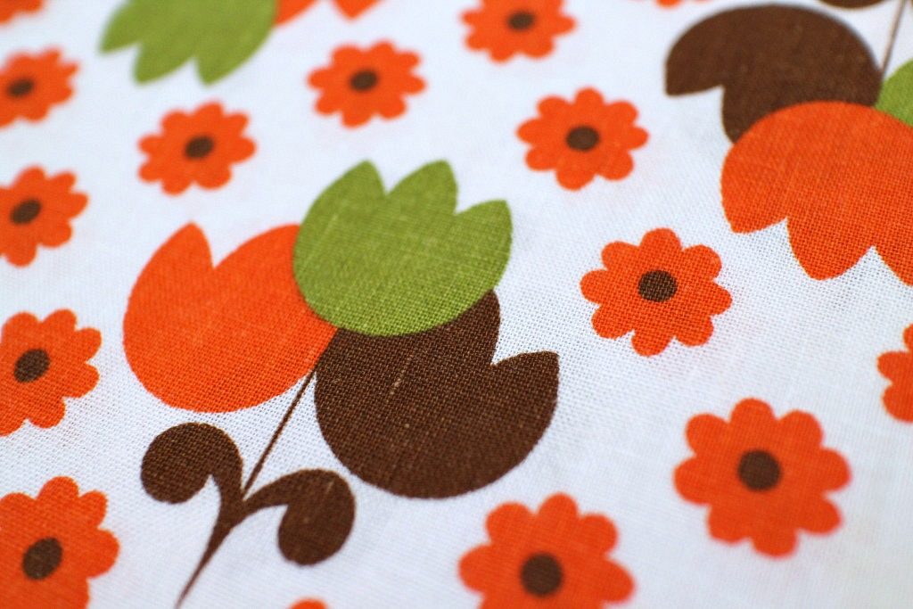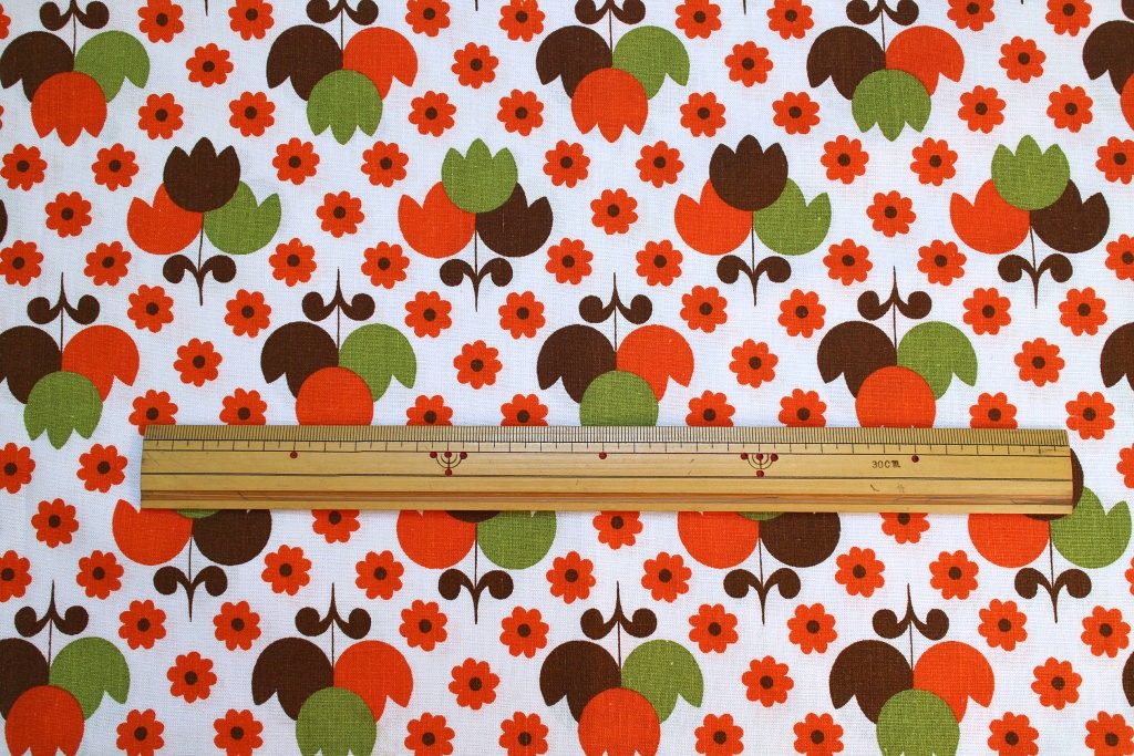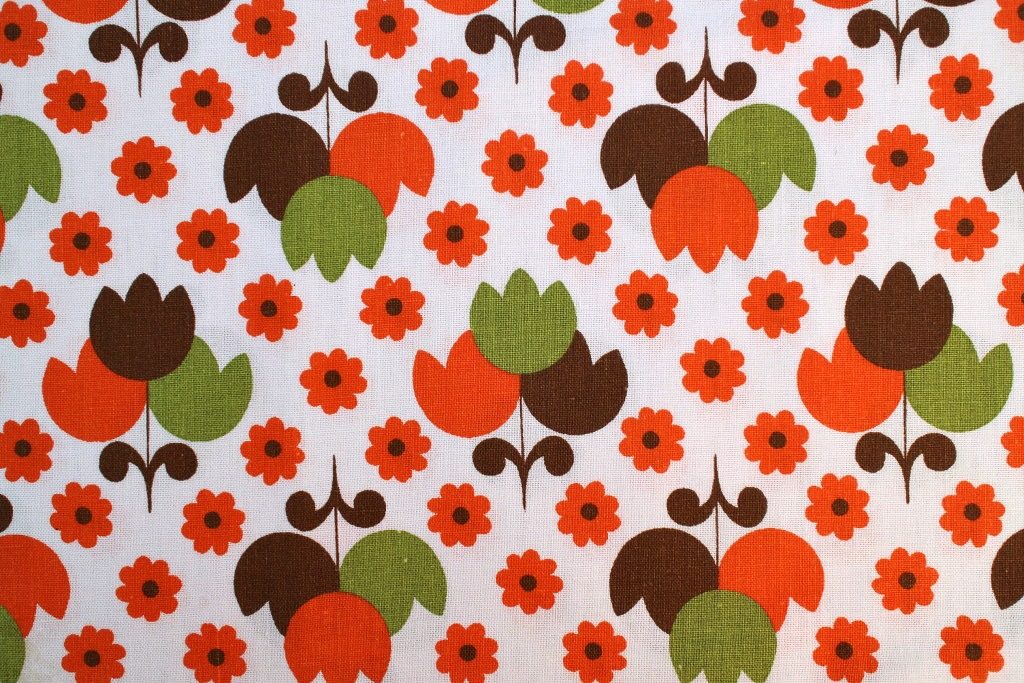オレンジ・カーキ・ブラウンのチューリップブーケが可愛く並んだほっこりカラーのレトロコットン生地。