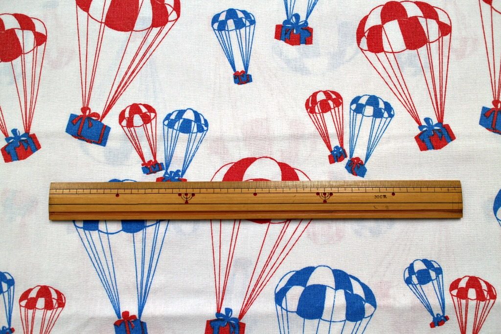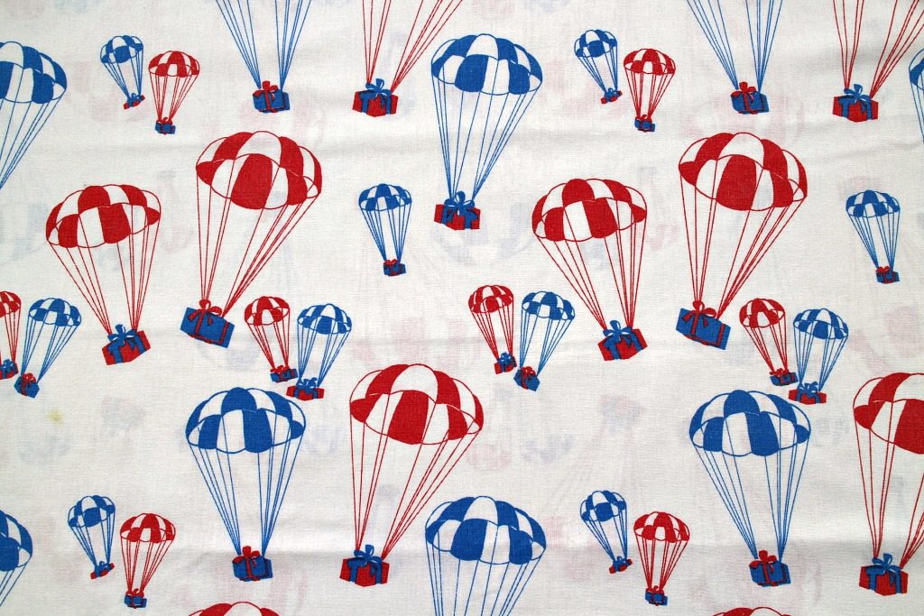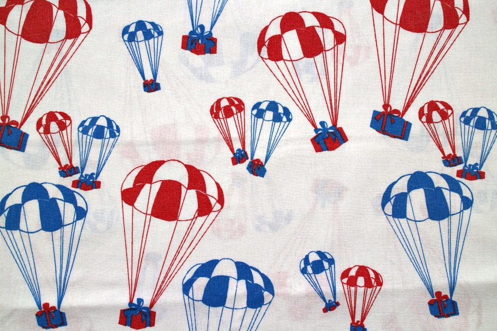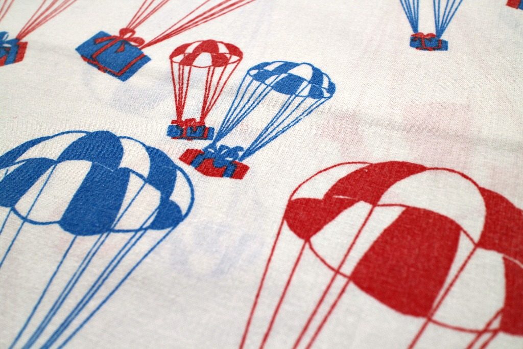 コンテンツにスキップパラシュートに乗せてたくさんのプレゼントが空から舞い降りてくる、夢いっぱいのデザイン。レッド&ブルーの色合わせがとってもレトロ。