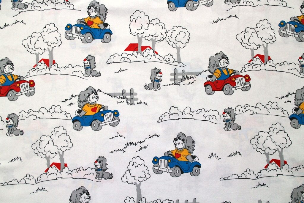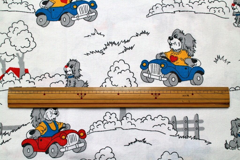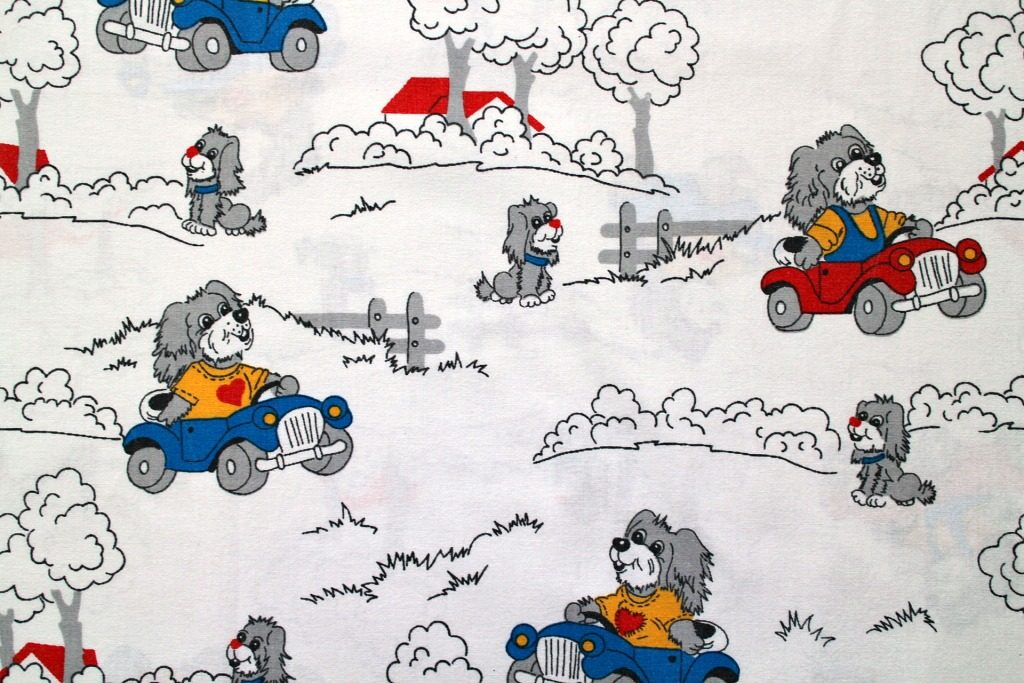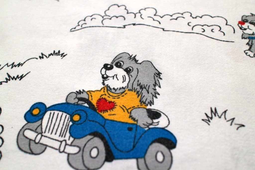 車を運転するお父さん?とそれを見送る子犬の姿がコミカルに描かれた白色ヴィンテージファブリック。