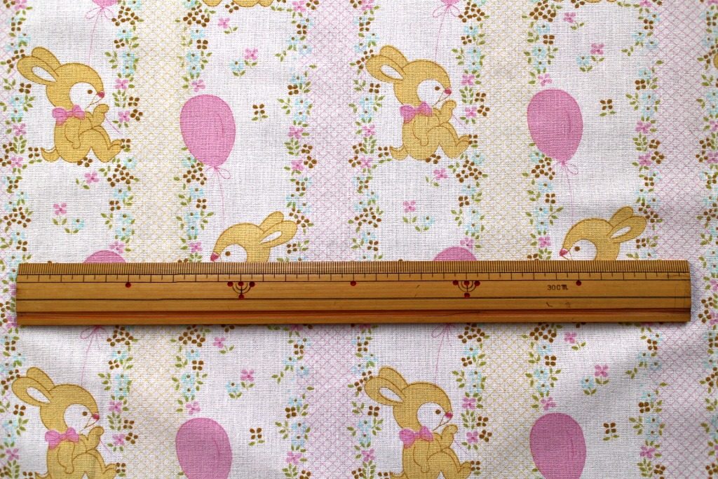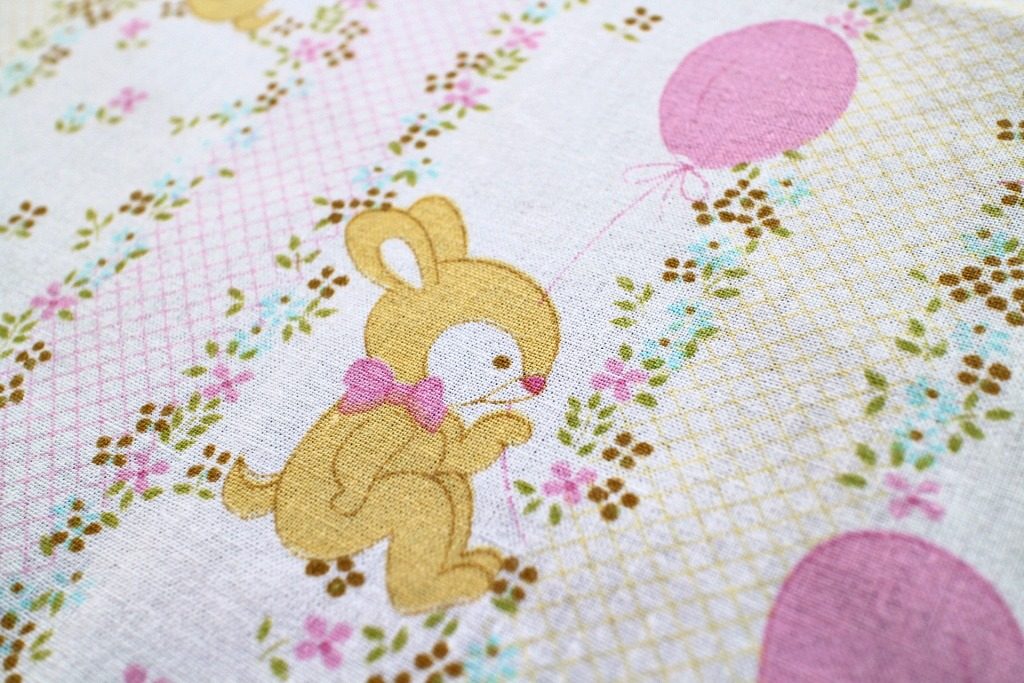 コンテンツにスキップピンクの風船につかまり空に浮かびあがるウサギが可愛いメルヘン柄ヴィンテージファブリック。