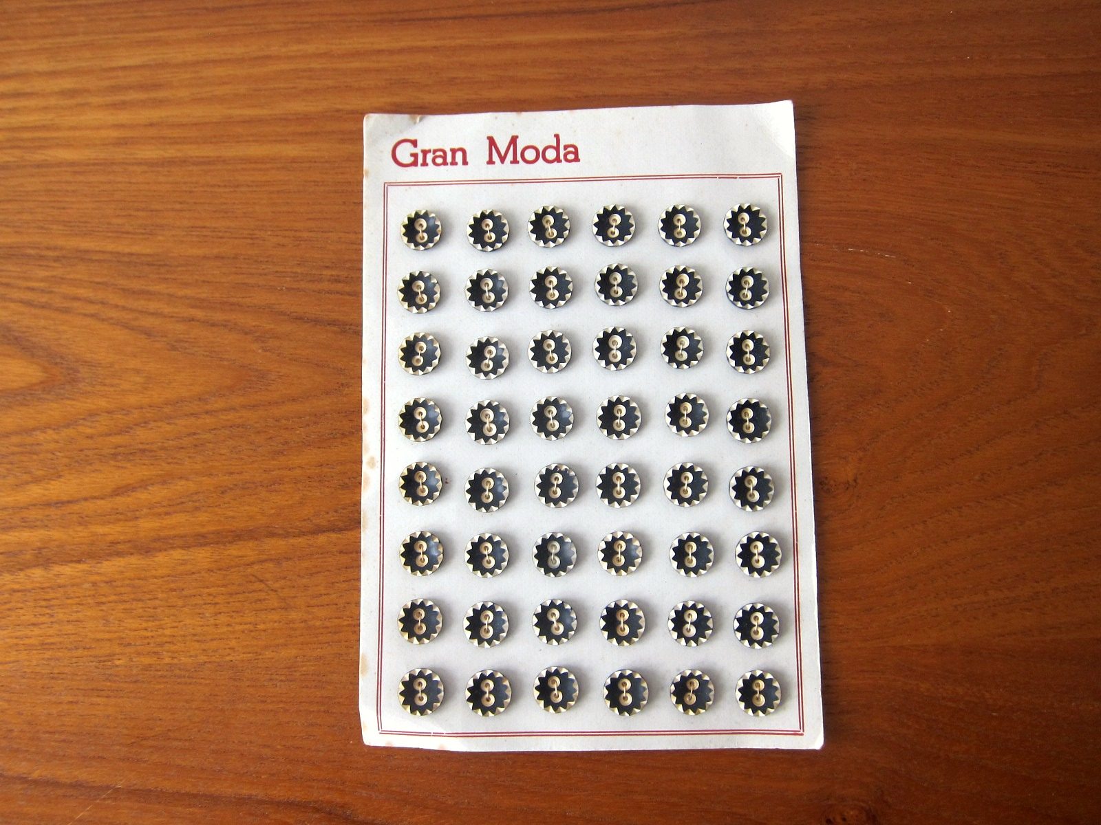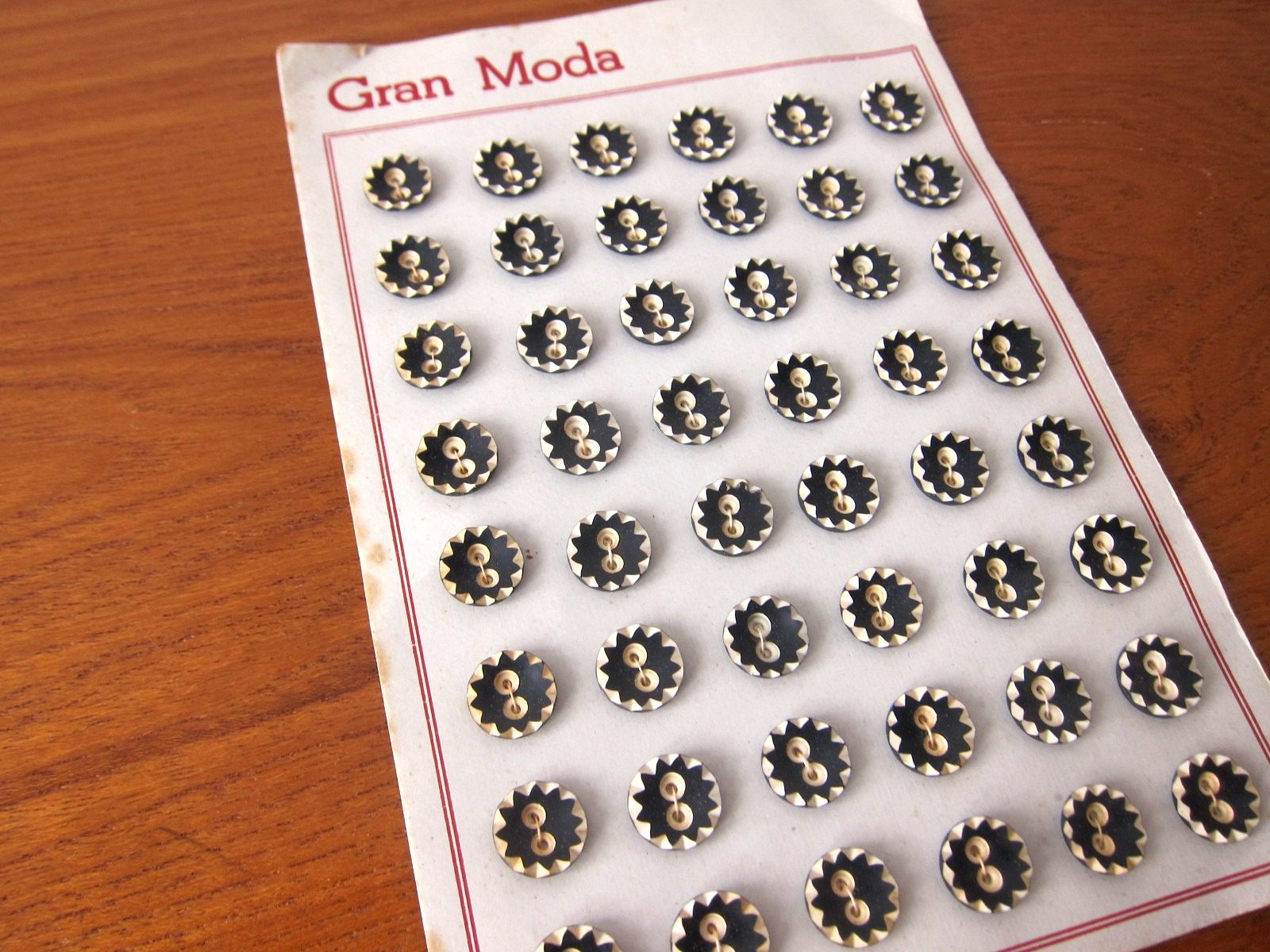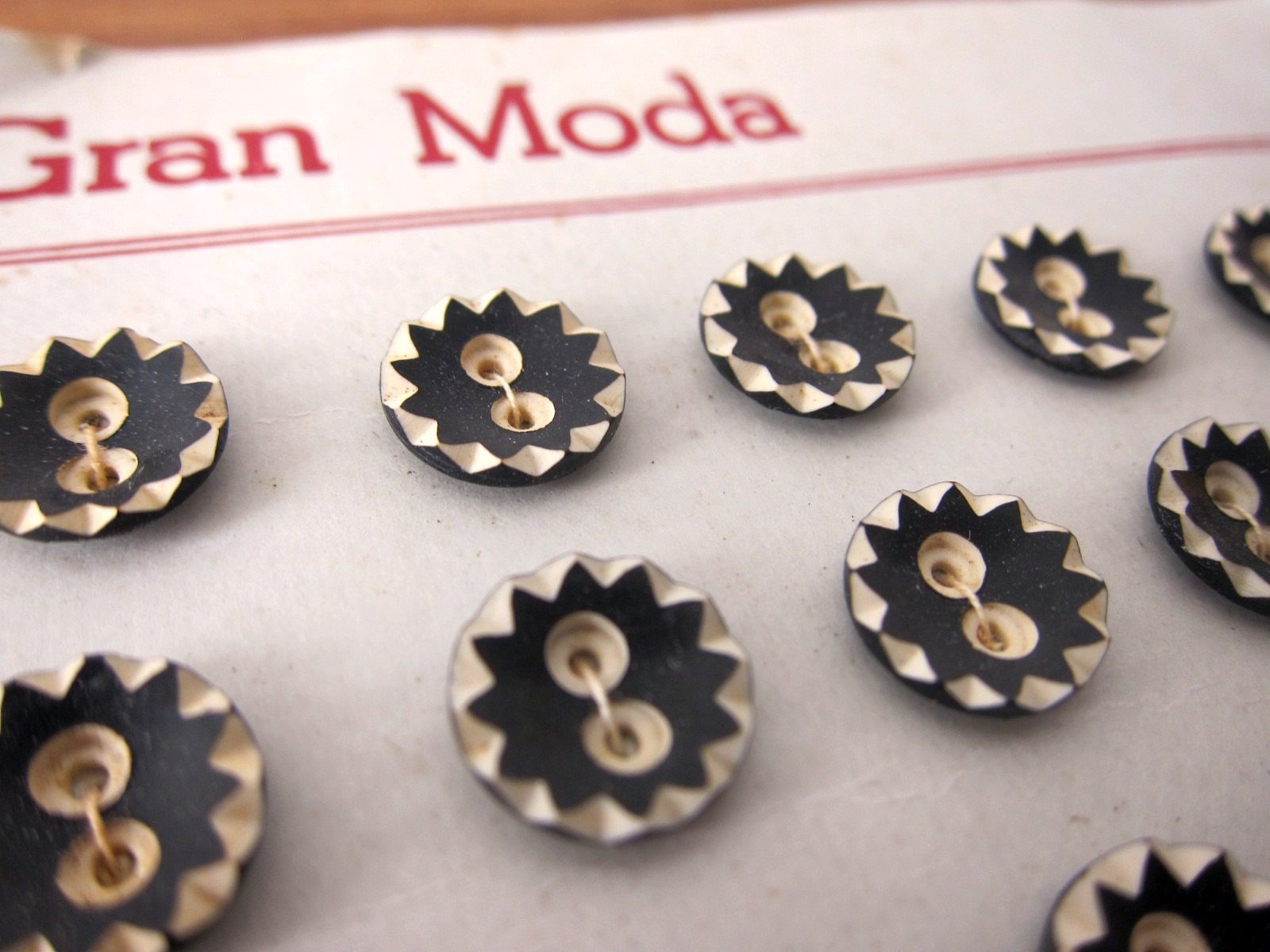 切り出したギザギザ模様がキッチュなヴィンテージボタンのセット。 レトロ感あふれる白黒モノトーンでシックな仕上がり。 48個入りなので手芸やボタンアートの材料にたっぷりとお使いいただけます。