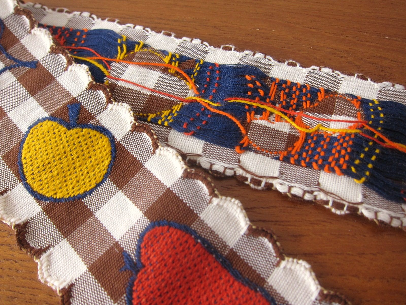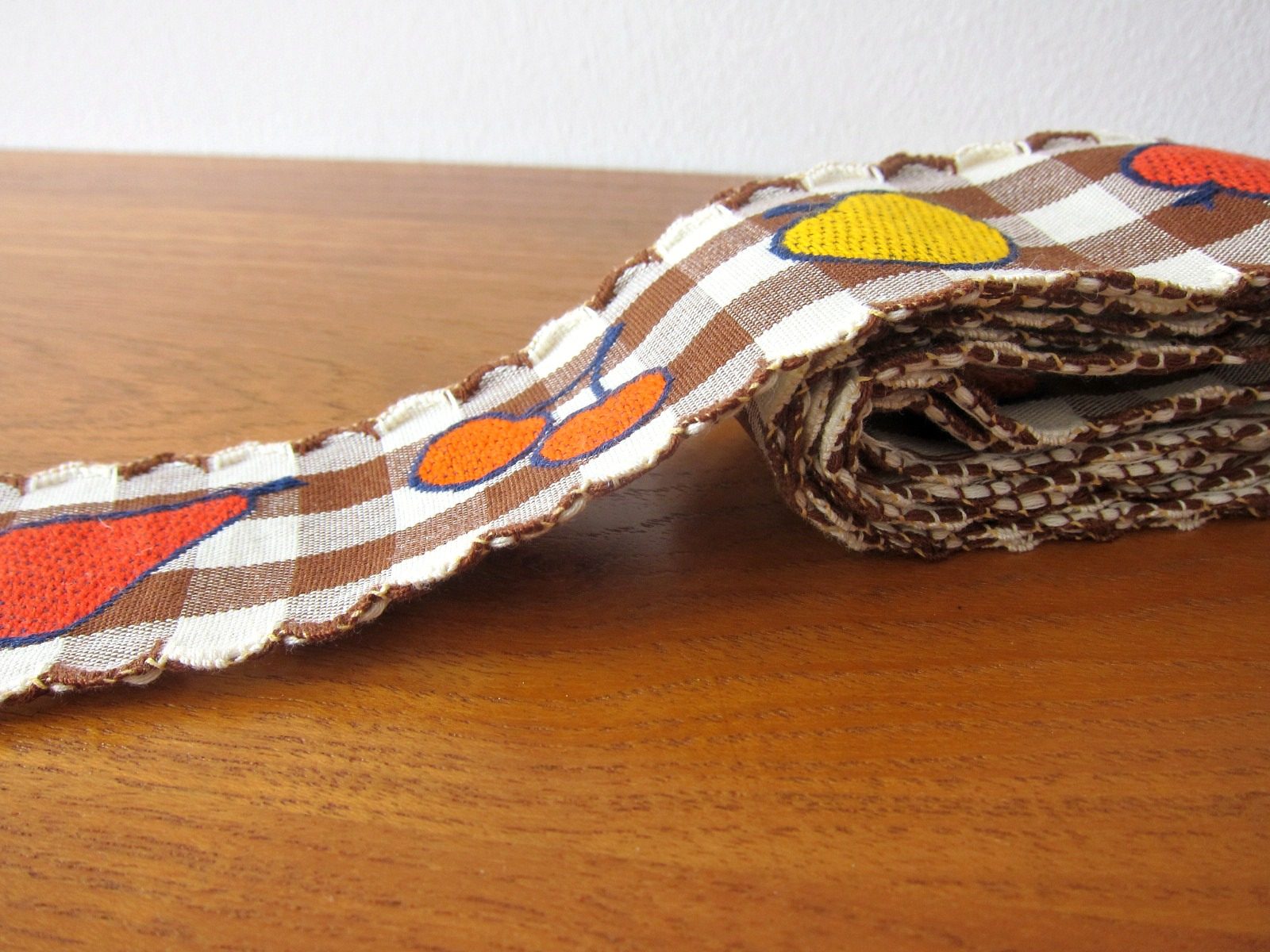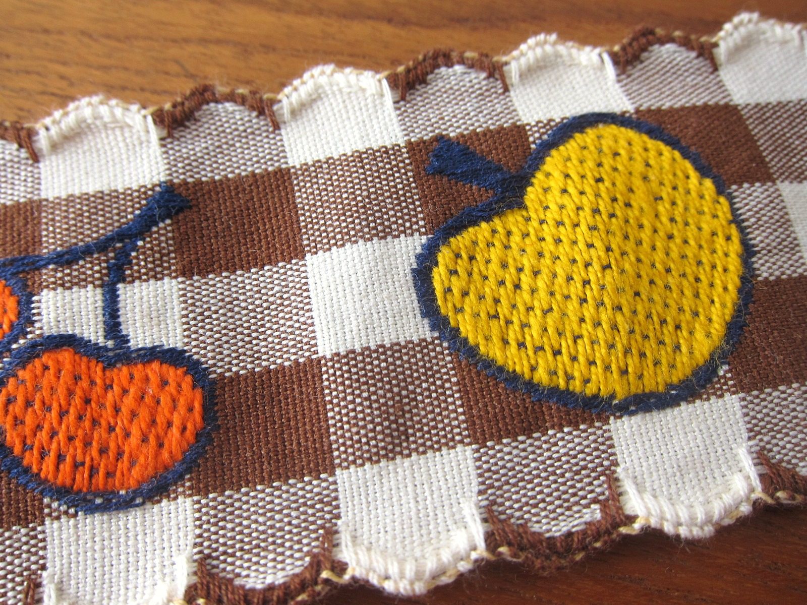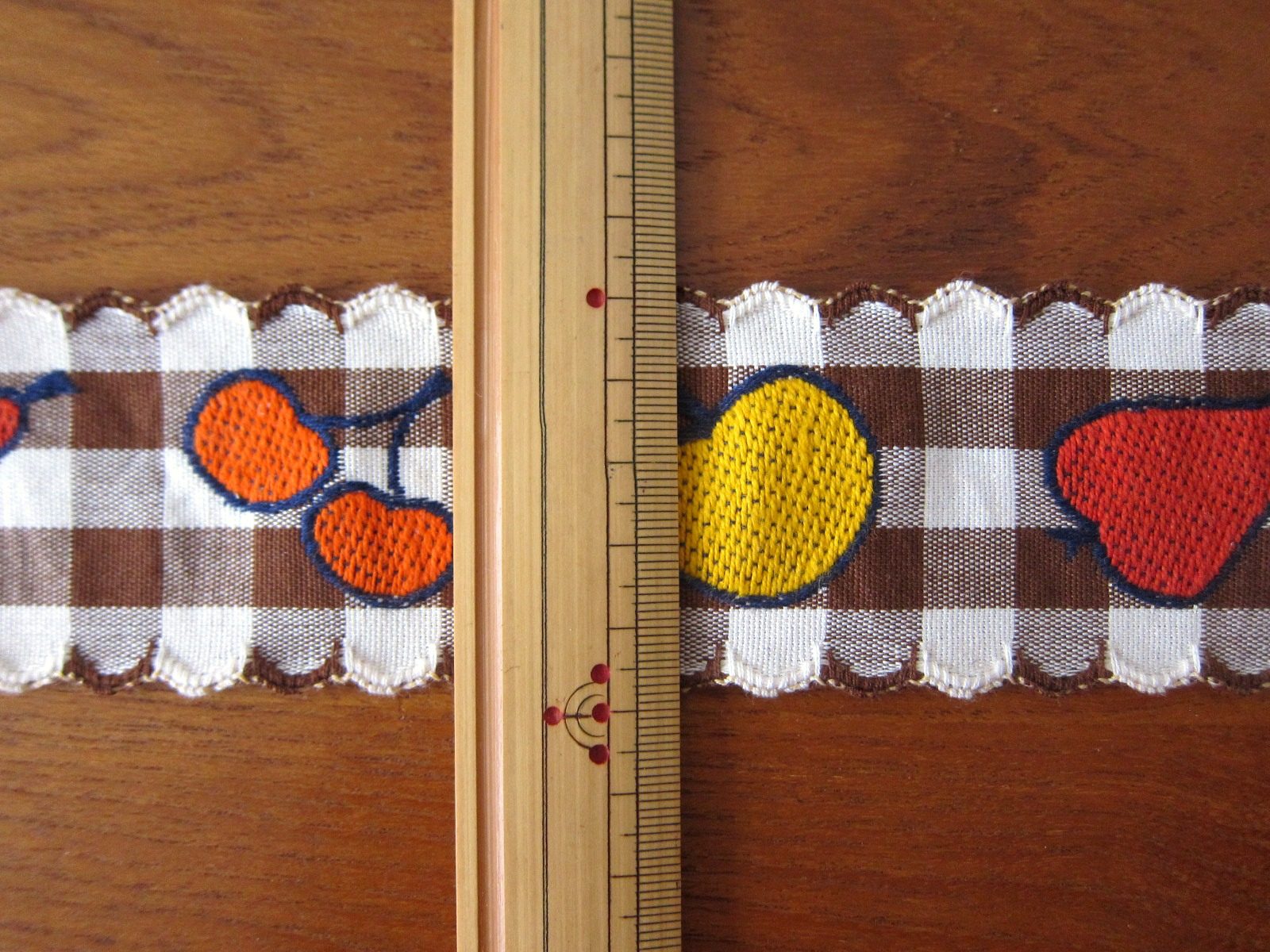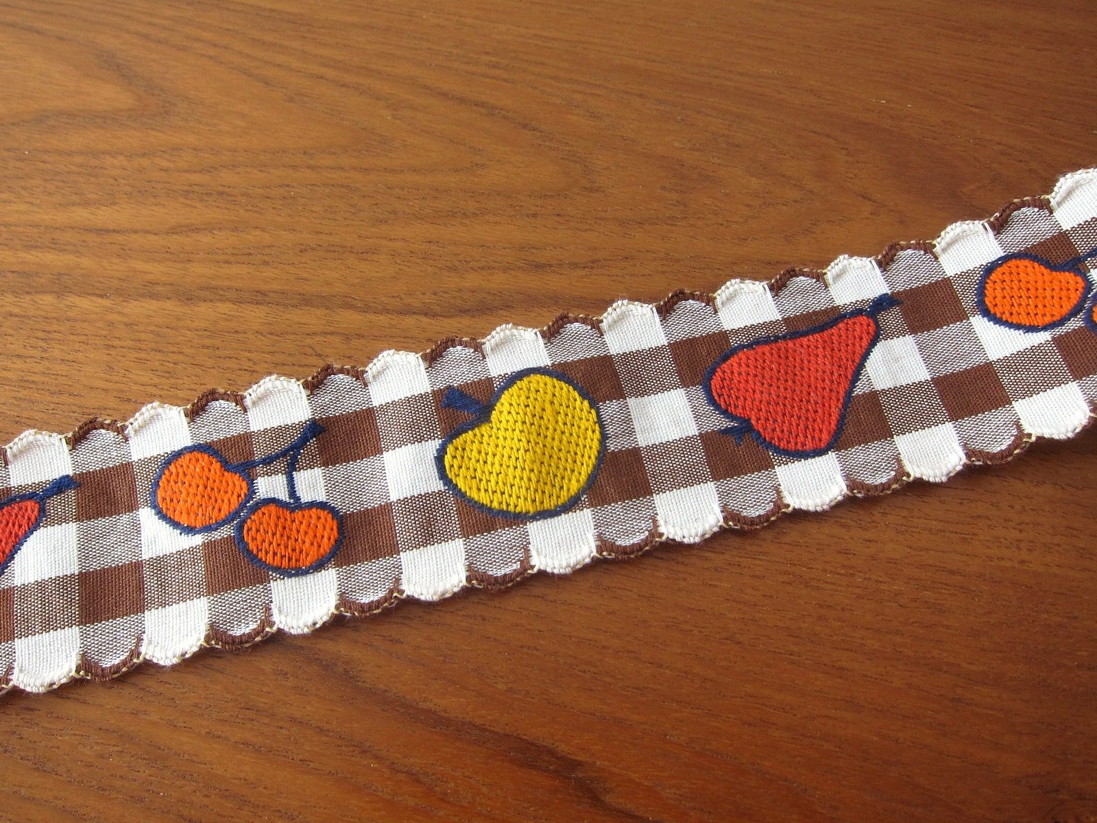 茶色と白のギンガムチェックな背景に、果物が並ぶレトロなチロルテープです。