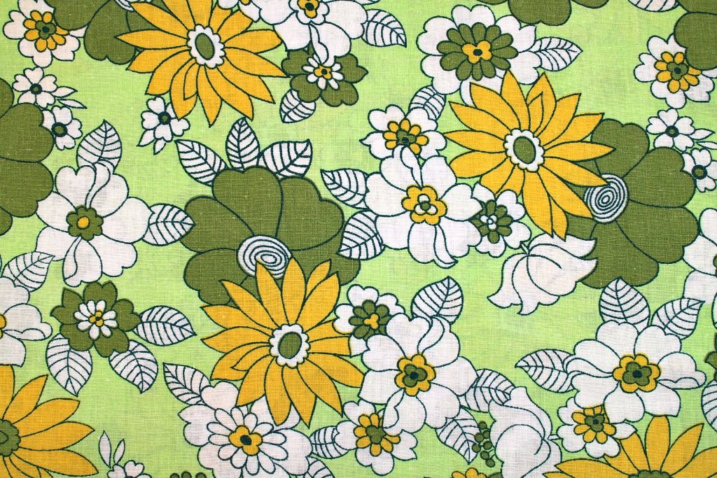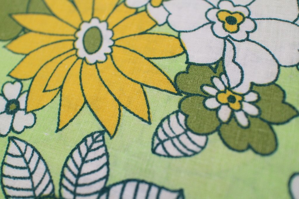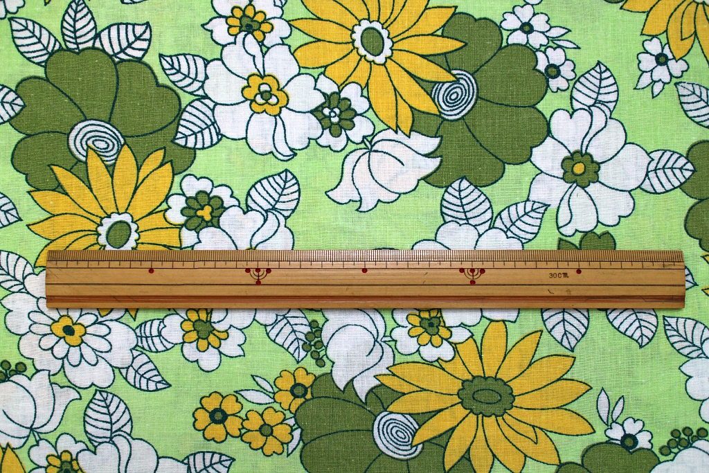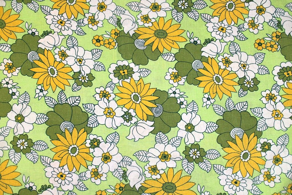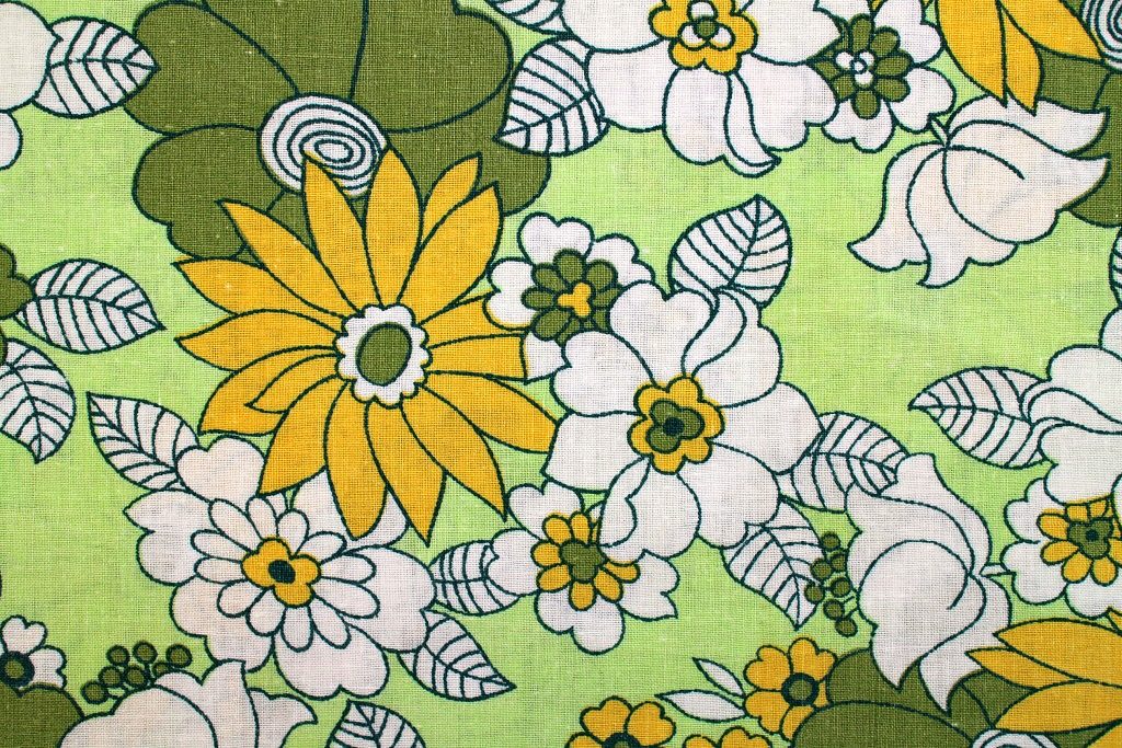 落ち着いたトーンの緑・黄色のお花と色を塗り忘れたような白いお花が散りばめられた、古典的ファッショナブルなレトロ柄ビンテージ生地。