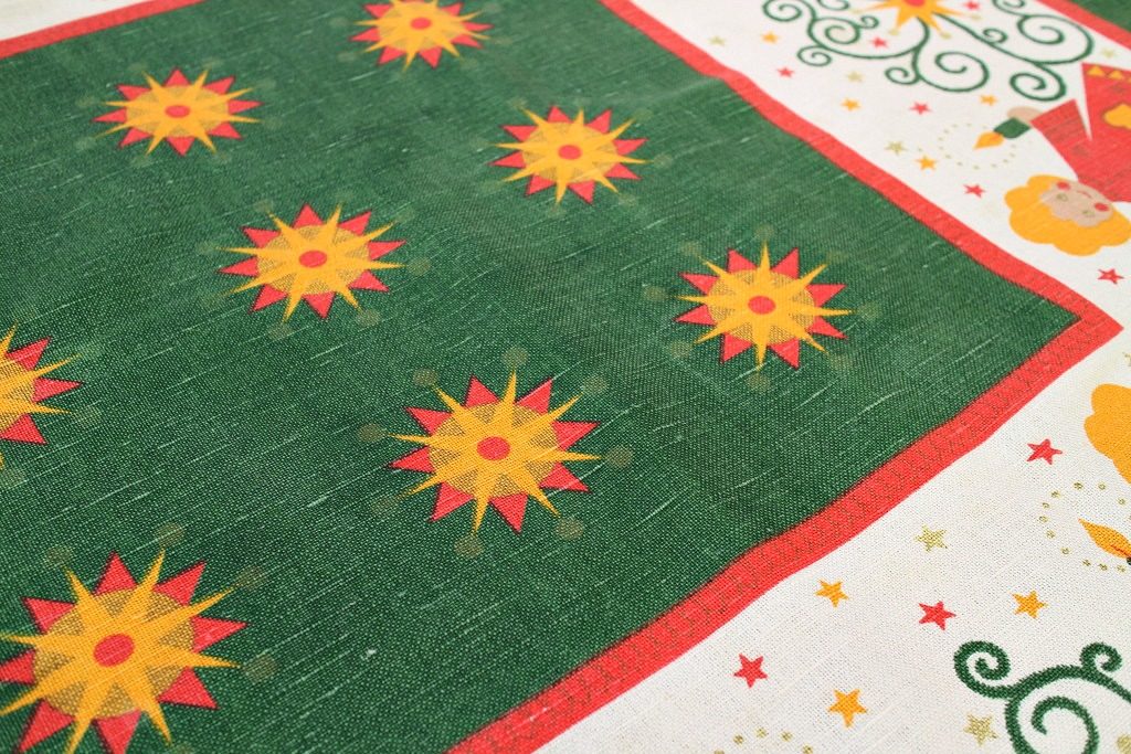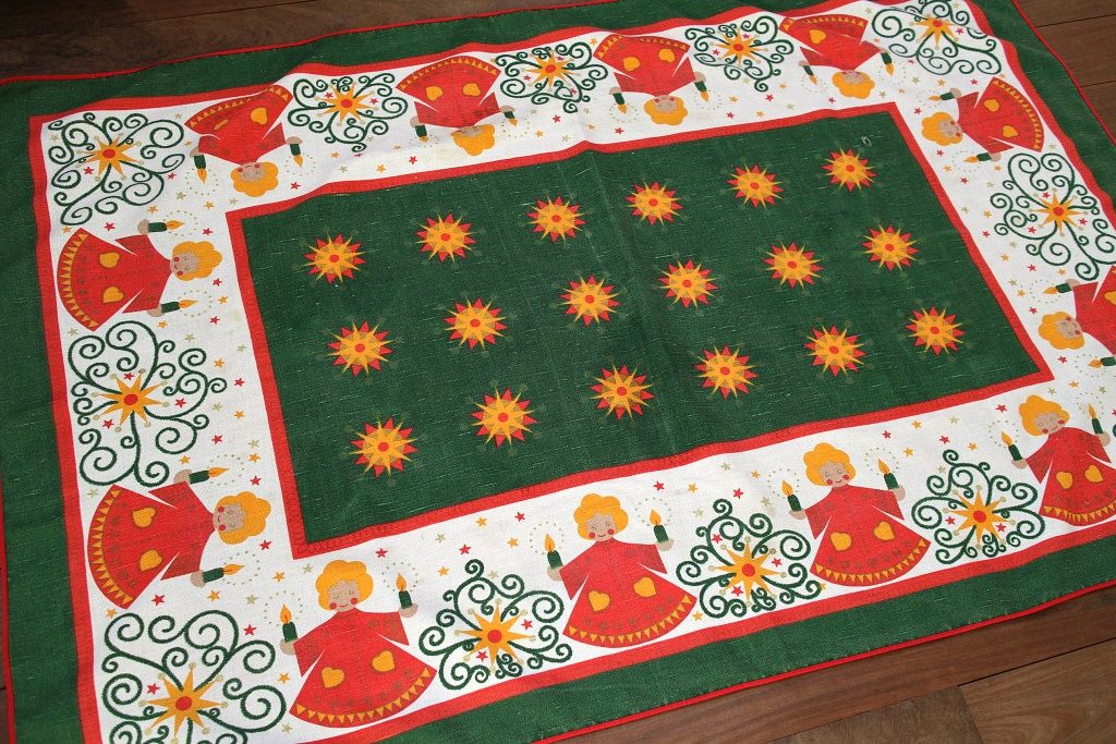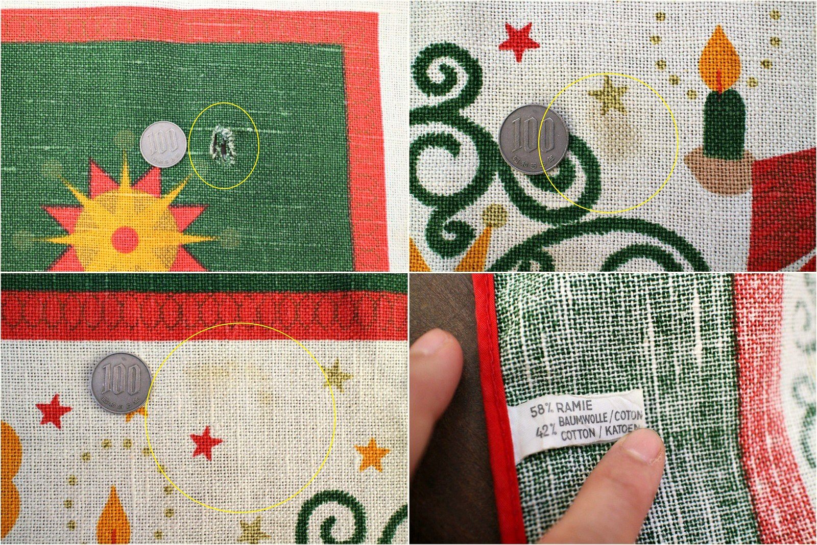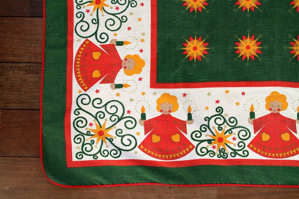 蚤の市で見つけた、キャンドルを手にした天使のイラストが可愛いノスタルジックなテーブルクロス。 炎のようなきらびやかな光のモチーフと赤&緑のクリスマスカラーが気分を高めてくれること間違いなし! 植物繊維ラミー(苧麻)混紡なのでとても丈夫です。 キッチンやお部屋のデコレーションにお役立てください。