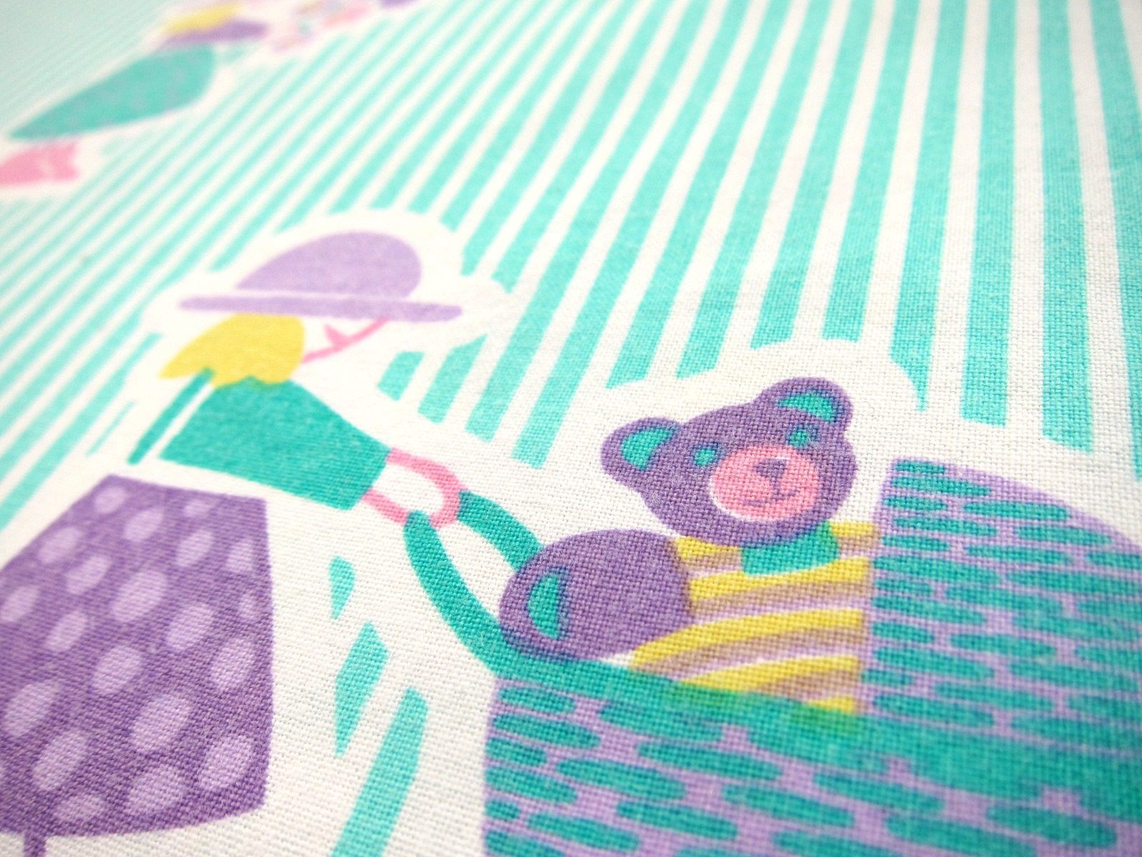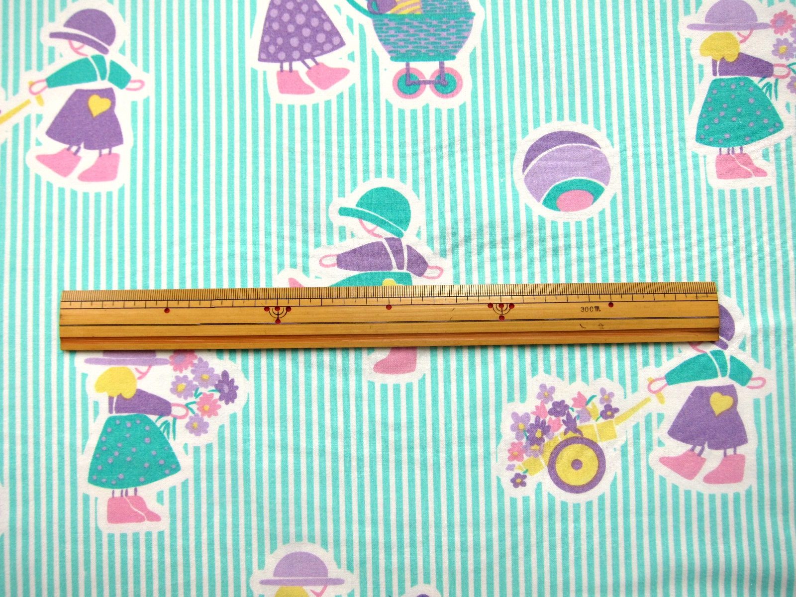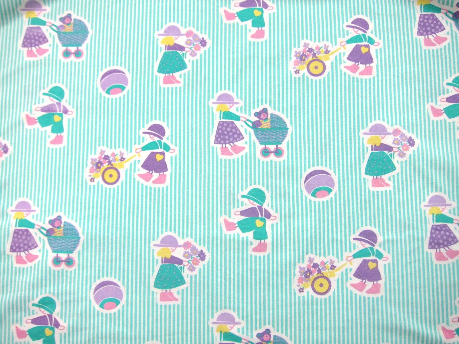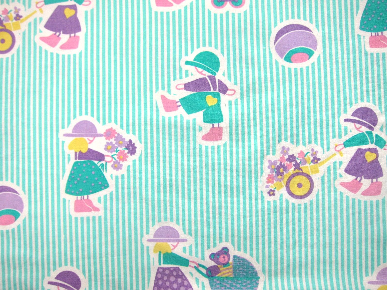 水色のしましまを背景に、乳母車や遊びに興じる子供たちがカラフルに描かれたレトロなファブリック。 子供部屋のインテリアやお子様の通園・通学グッズ等にいかがでしょう。 見ているだけで心が温まるデザインです。