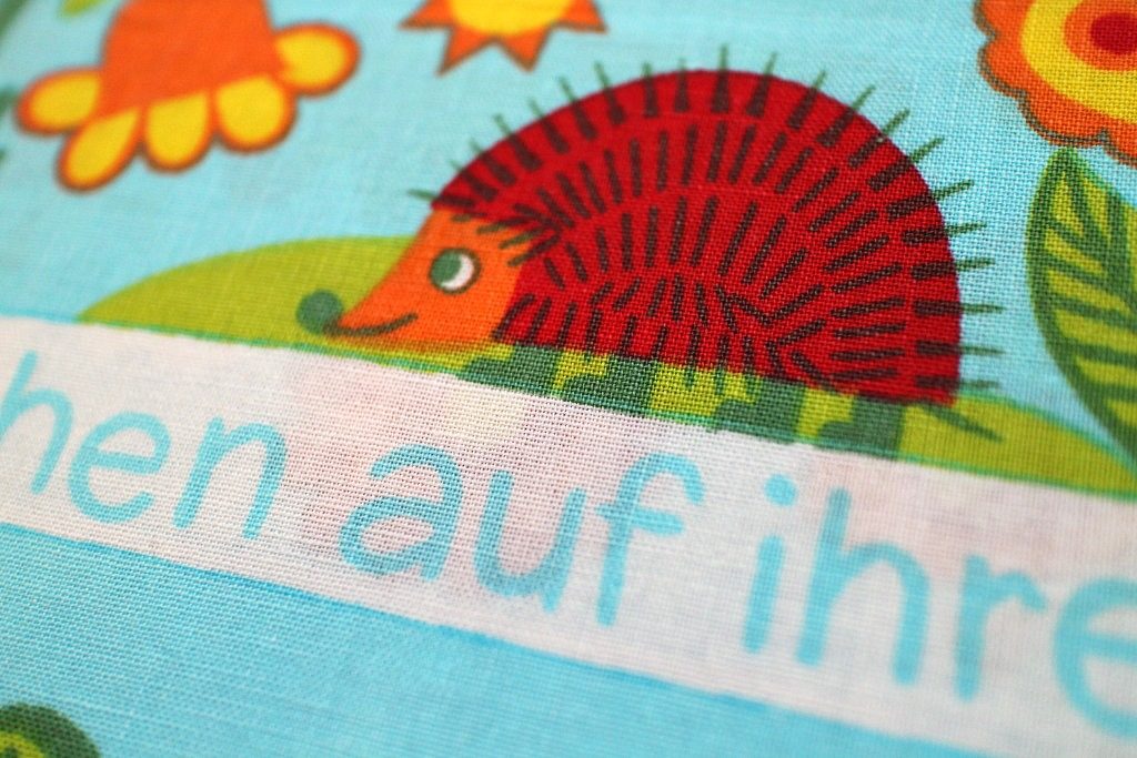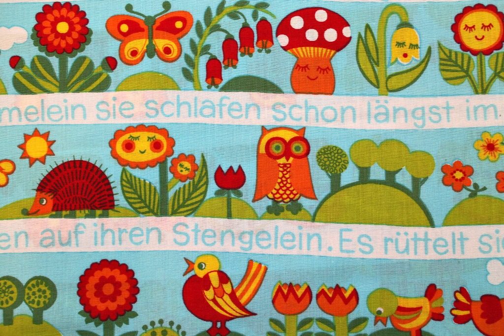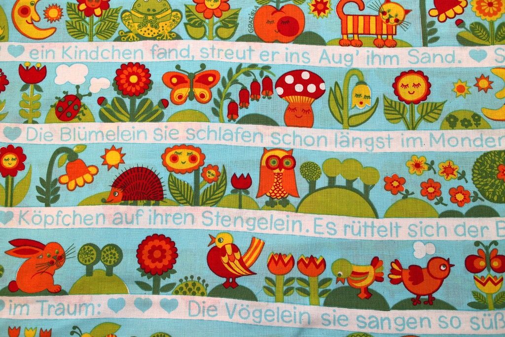 赤いキノコやハリネズミなど楽しいイラストとドイツ語メッセージが入ったGrazielaヴィンテージ布を再入荷しました。