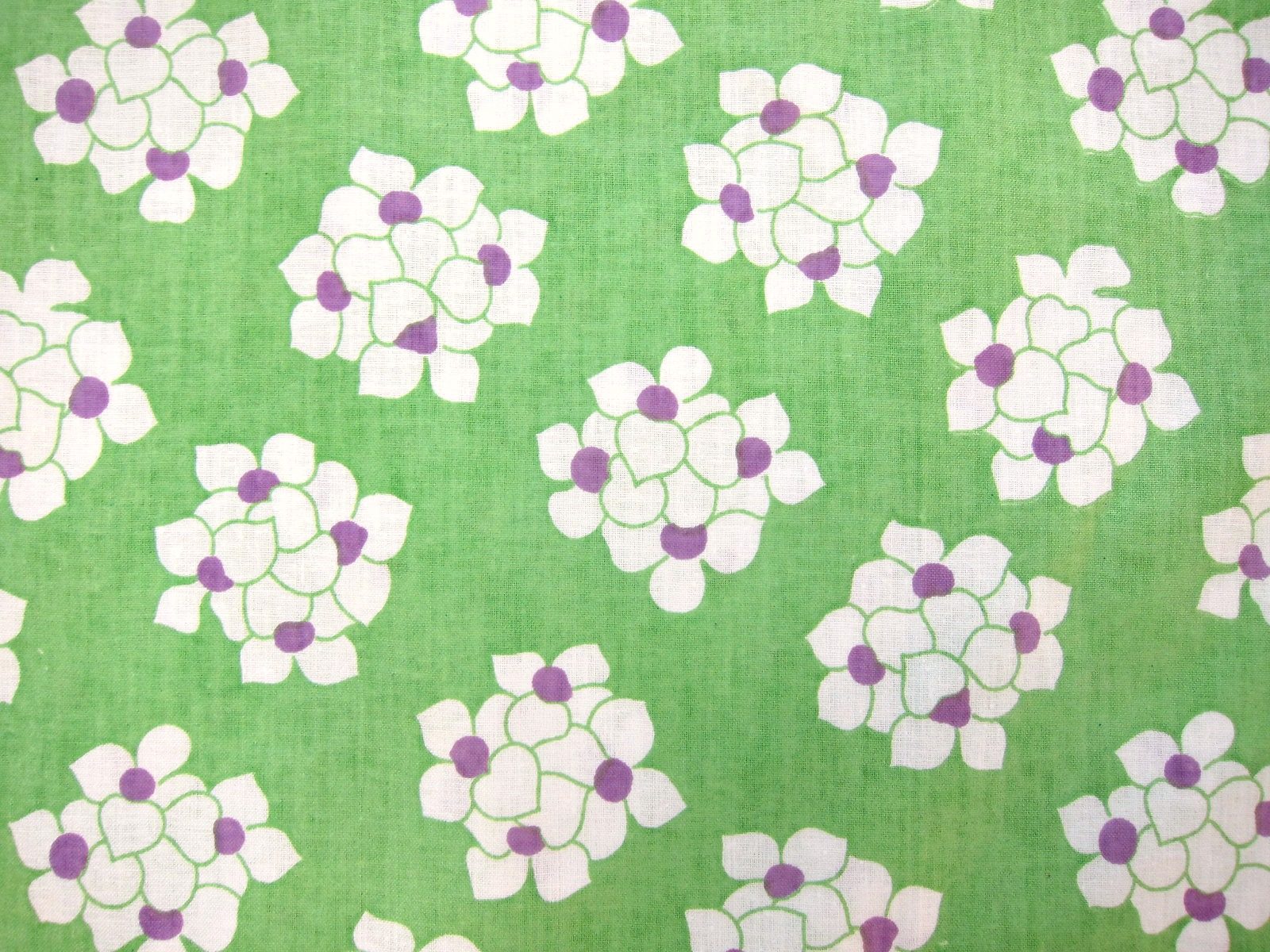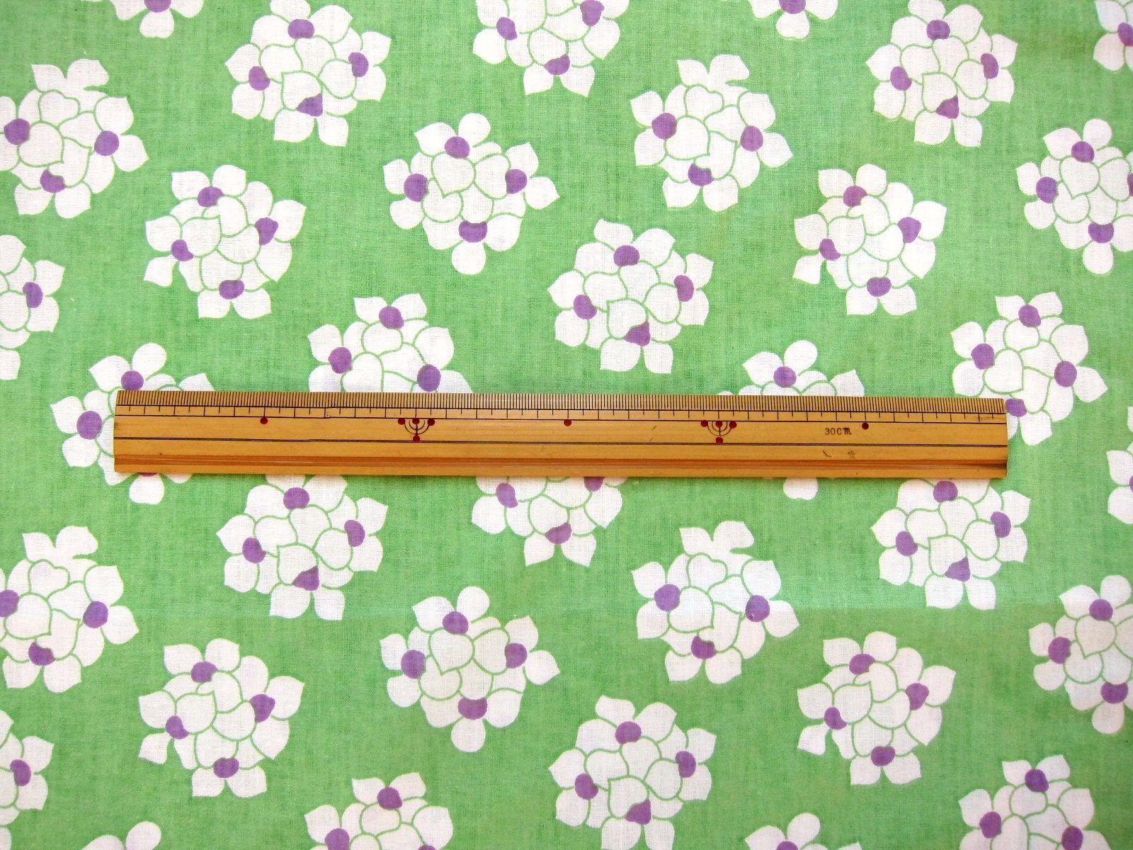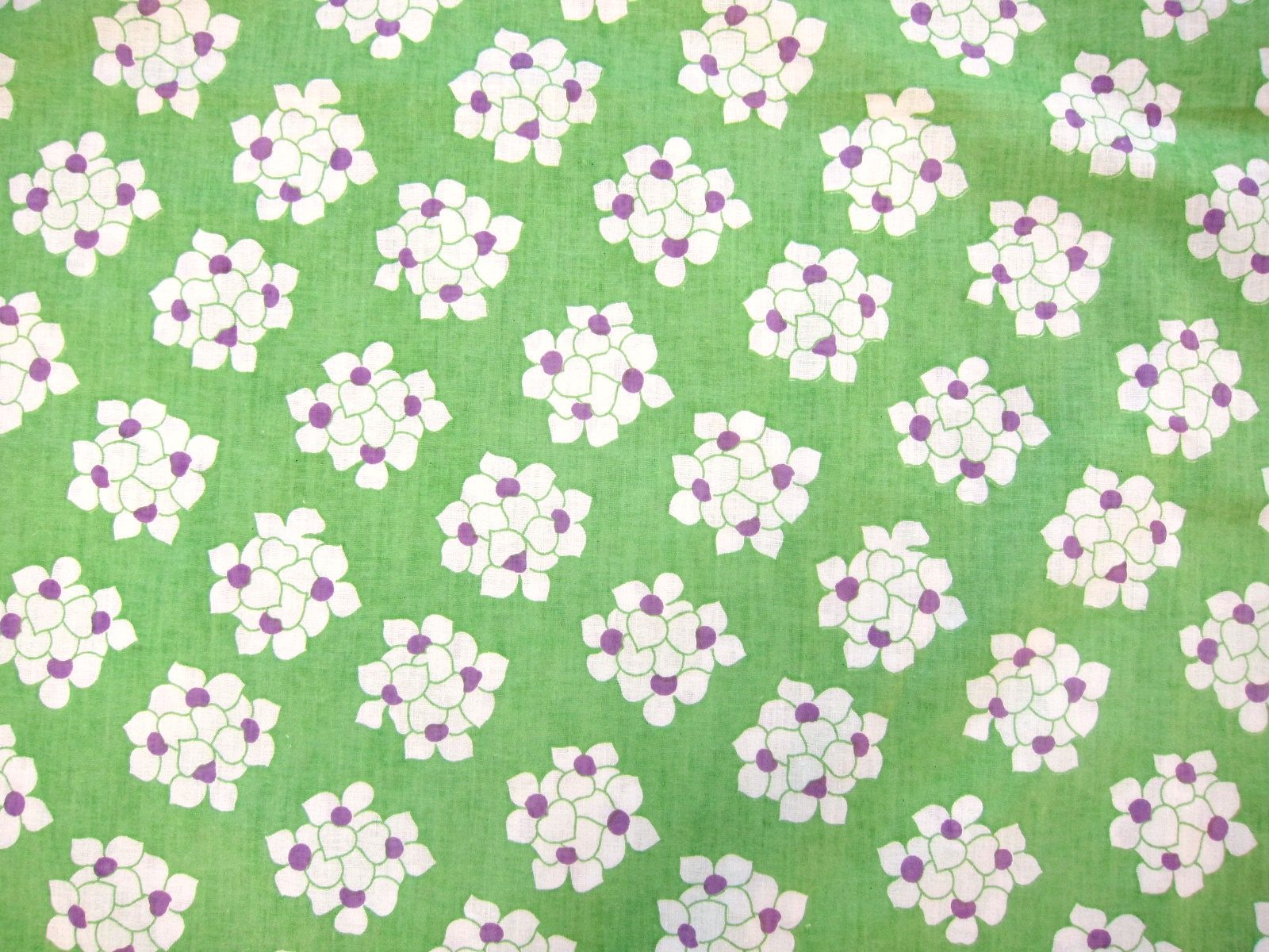 70年代オリジナルのデッドストック、レトロな花柄モチーフのヴィンテージファブリック。 明るい緑色のベースに、白のお花のモチーフが入った甘過ぎない雰囲気の柄です。