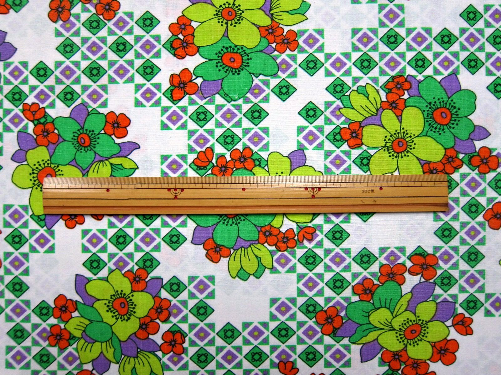 サイケデリックな雰囲気のある、緑や紫のヴィンテージファブリック。 お花のイラストが入ったレトロでファンキーなパターンです。
