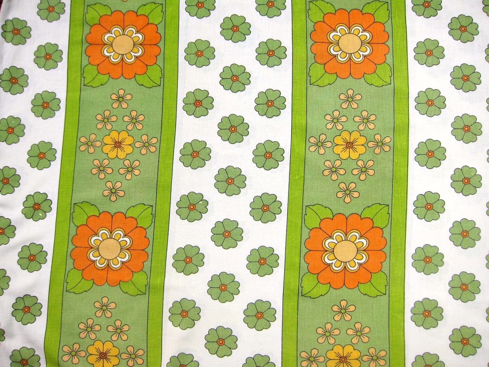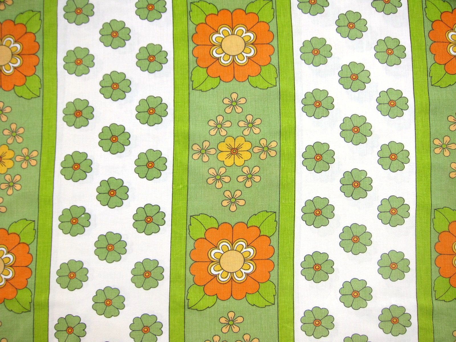 コンテンツにスキップオレンジと黄色のお花を並べた、ちょっぴりくすんだ緑のラインと、同じく緑の小花を散りばめた、白いラインを交互に配置したレトロ感いっぱいのビンテージ生地。